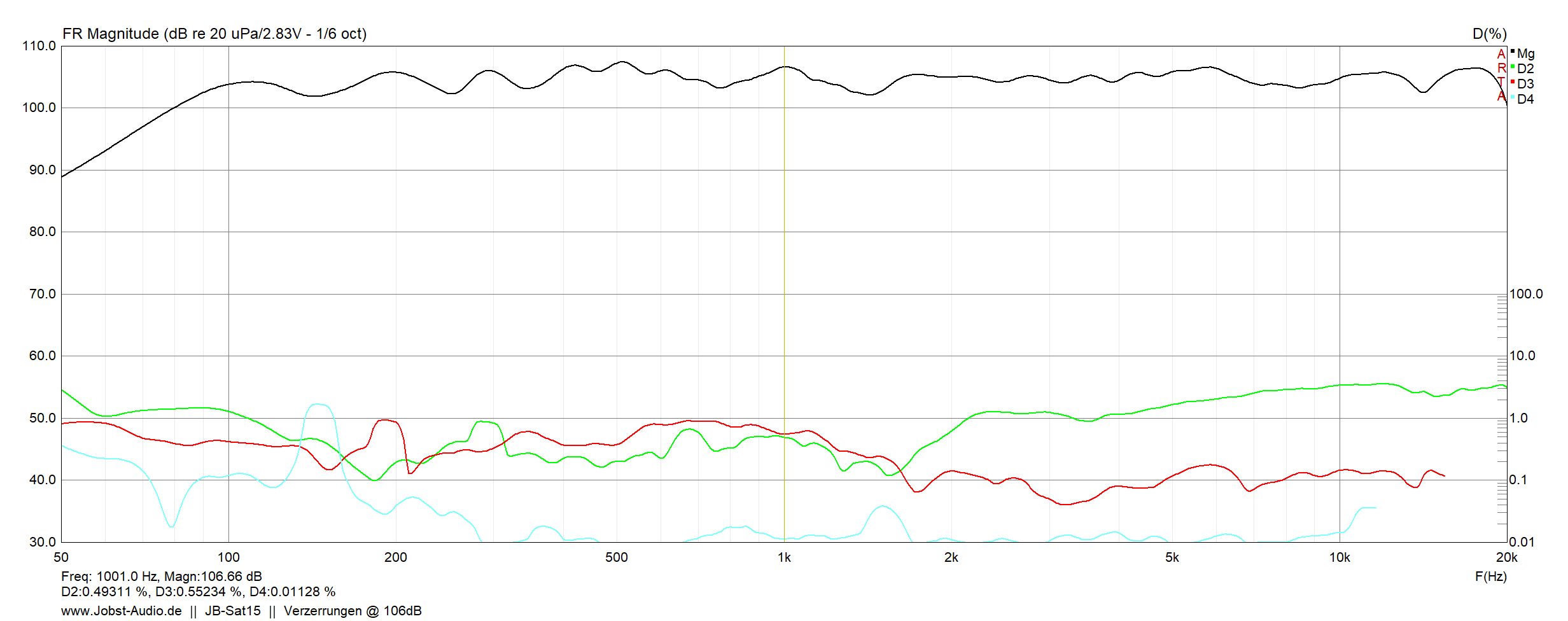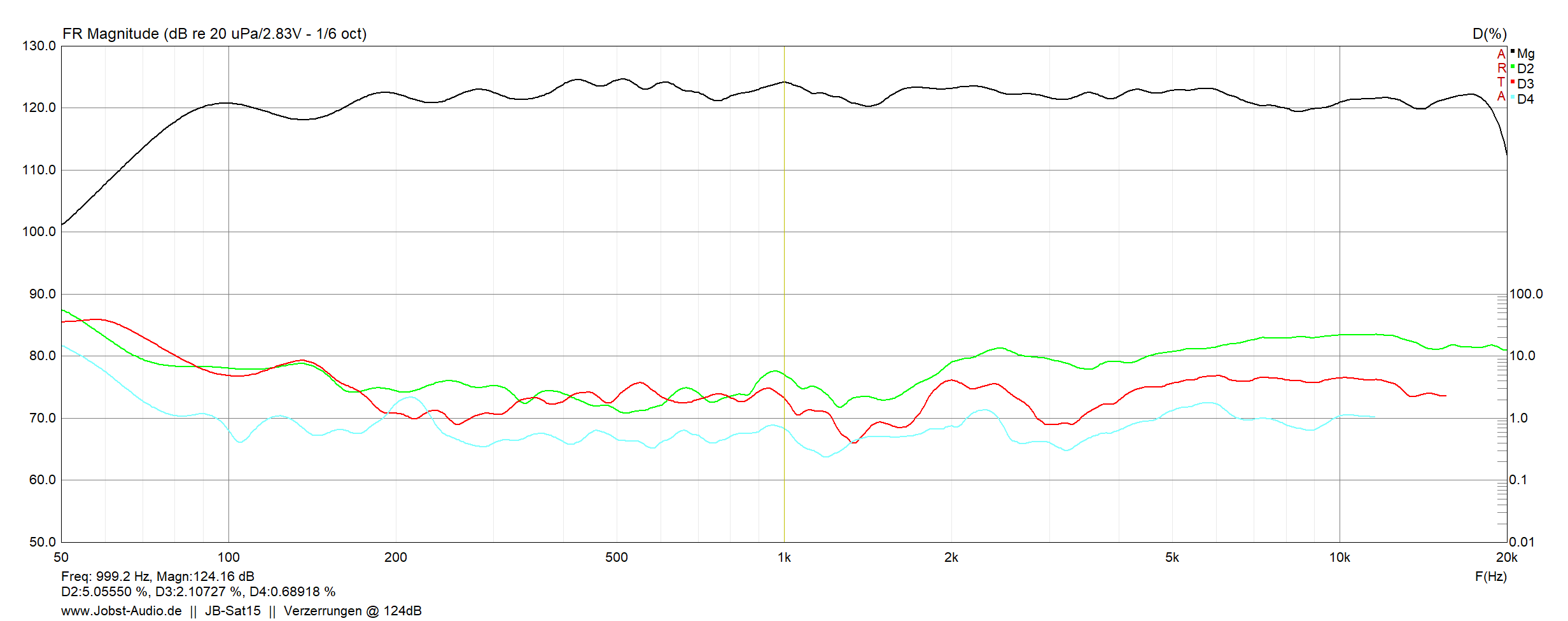 Verzerrungen habe ich bis 124dB gemessen, die 10% K3 Verzerrungen werden dabei erst im Bassbereich unterhalb 80Hz erreicht.