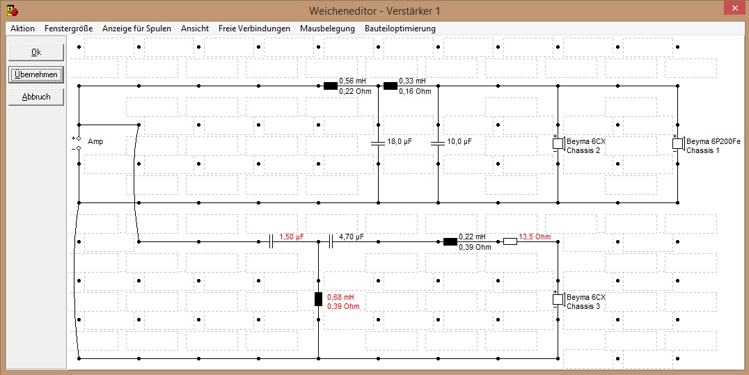 Nachdem Boxsim dann am Start war auch mal eben hingesetzt und ein bisschen Weichen gebastelt, was letztendlich herauskam entsprach dann zu 80% der Weiche aus dem Baukatalog von Beyma, d.h. so ganz übel ist sie nicht, hab lediglich zwei Werte etwas geringer bzw. höher gewählt (was nicht erwähnt wird: Der Hochtöner muss verpolt werden!)