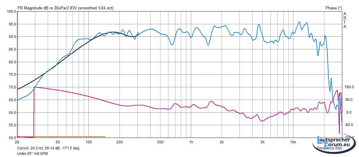 Schwarz ist der Gesamtfrequenzgang mit angehänger GPM für den Bassbereich.