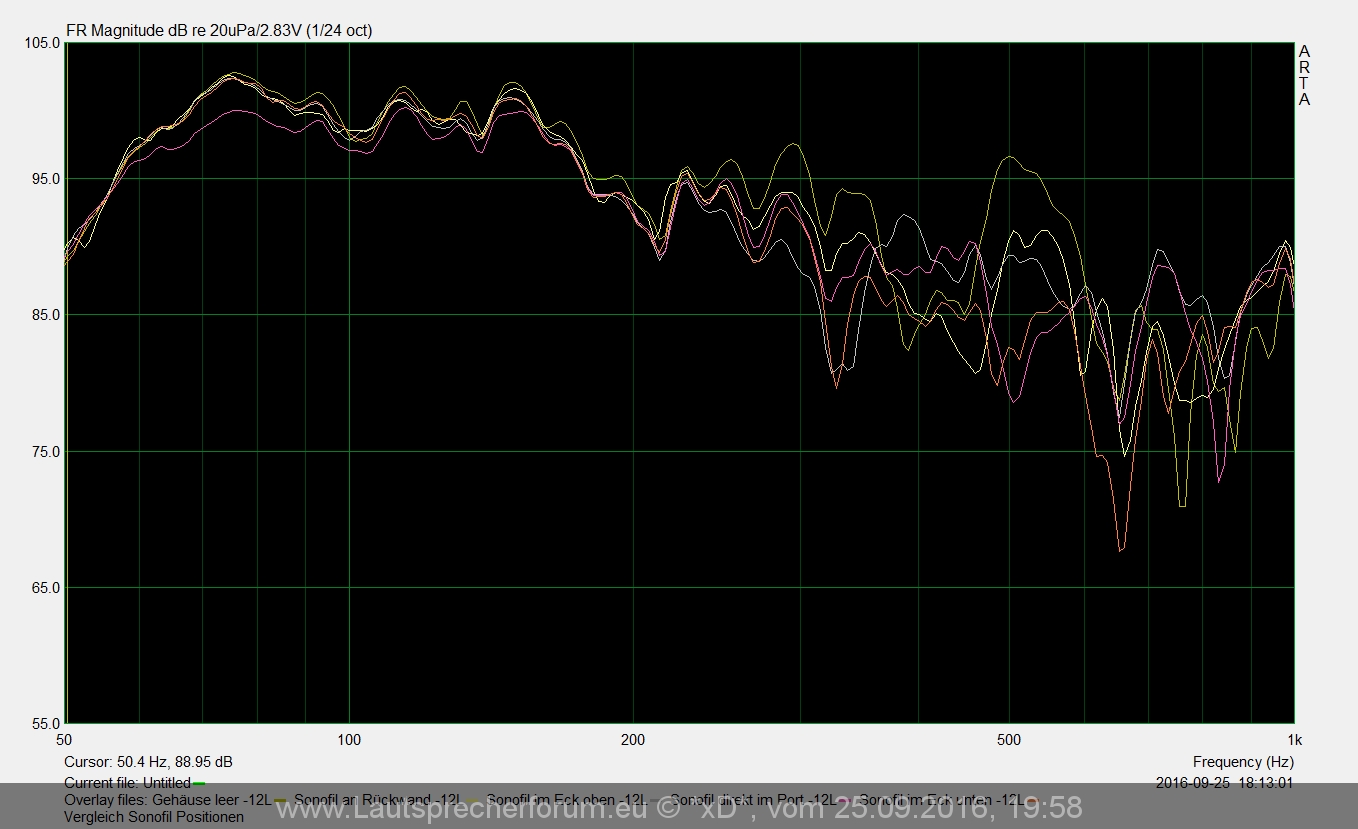 Ebenso wurde mit Sonofil in Vor- und Rückkammer experimentiert. Die Rückkammer zeigte das zu erwartende Verhalten, dass die untere Flanke flacher wurde. Entgegen der Simulation bewirkte Sonofil in der Vorkammer dagegen ein breitbandigeres Verhalten auf Kosten des Pegels - eigentlich müsste es anders herum sein. Resonanzen verminderten sich oberhalb 200Hz mess- und auch gut hörbar, verringerten aber auch den Nutzpegel.