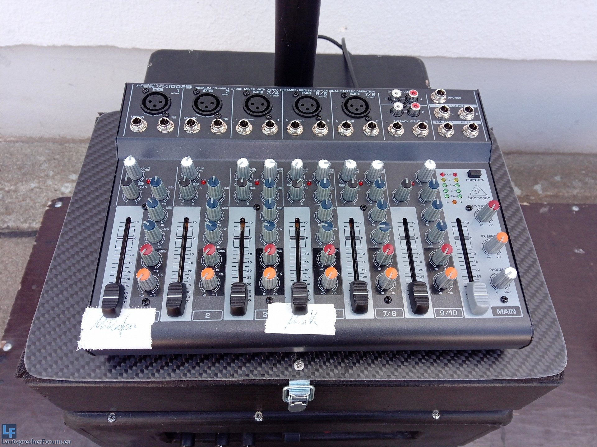 Ich habe hierzu den Mixer "Behringer Xenyx 1002b" genutzt, der ebenfalls mit 3 Stück 9V Blöcken betrieben werden kann.