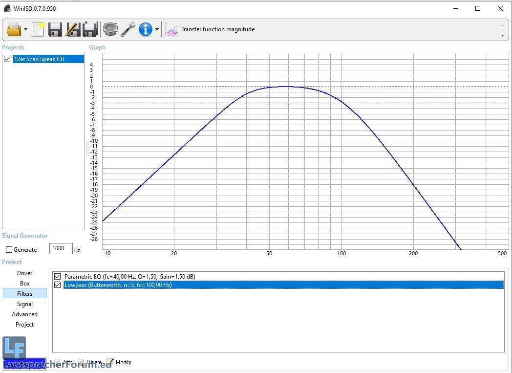 Die Filter sind folgendermaßen gesetzt: Highpass 30hz/18db, Lowpass 100hz/18db, Parametrischer EQ 40hz, Q=2,0, +4db. Bei 140W erreichen die Treiber das X-Max von 8mm.