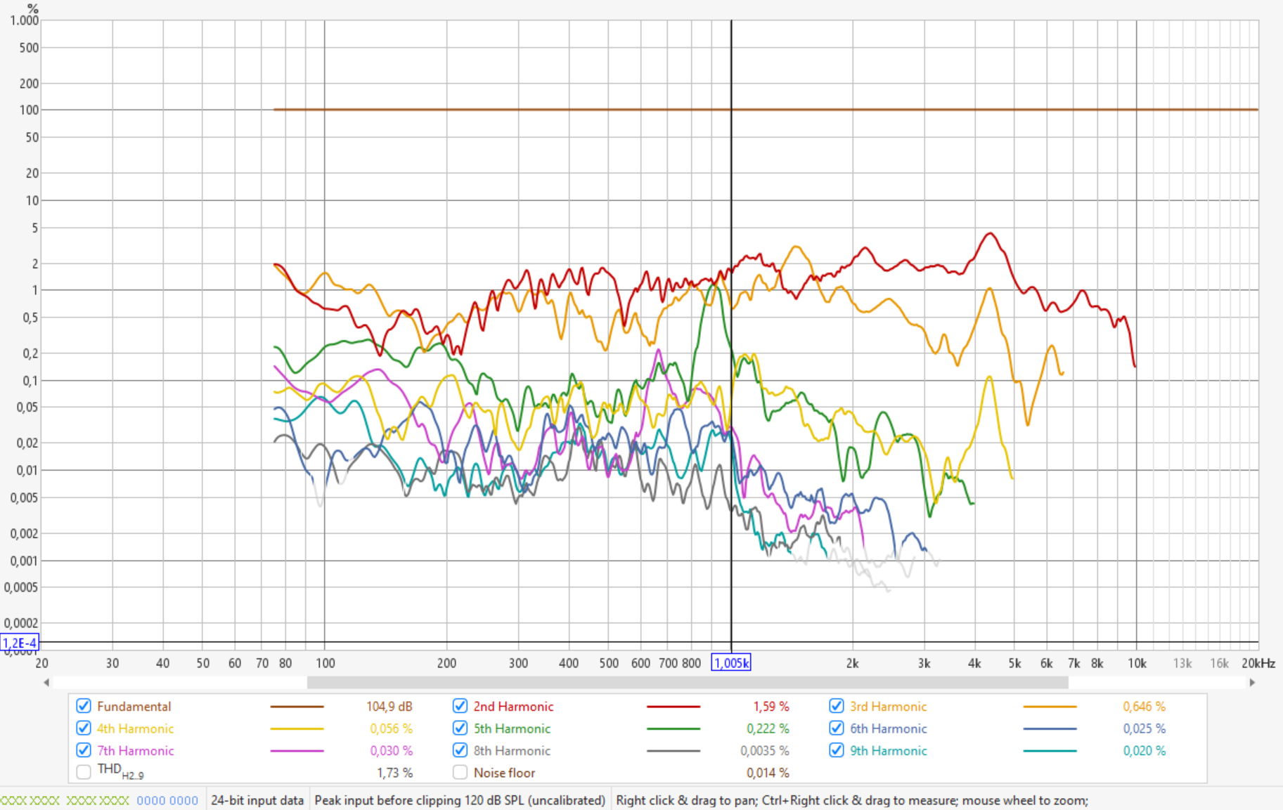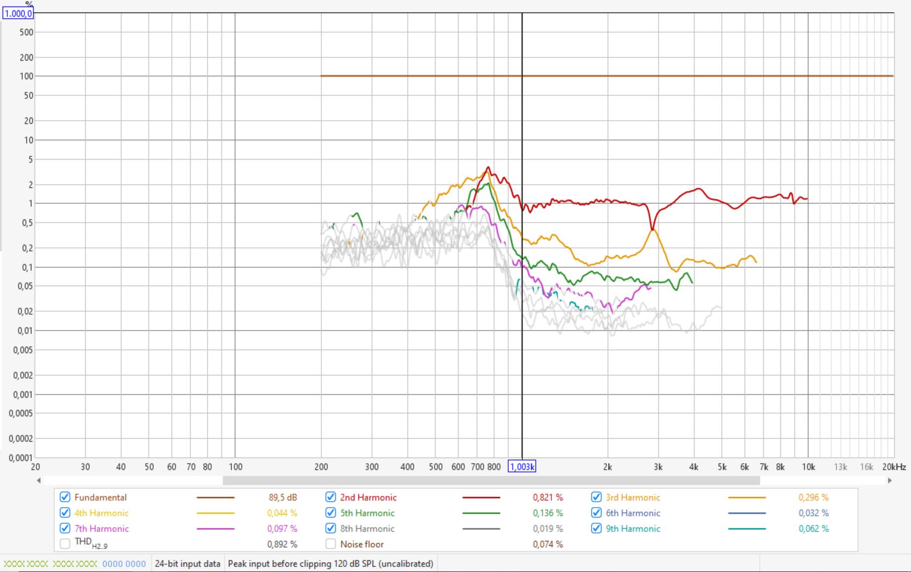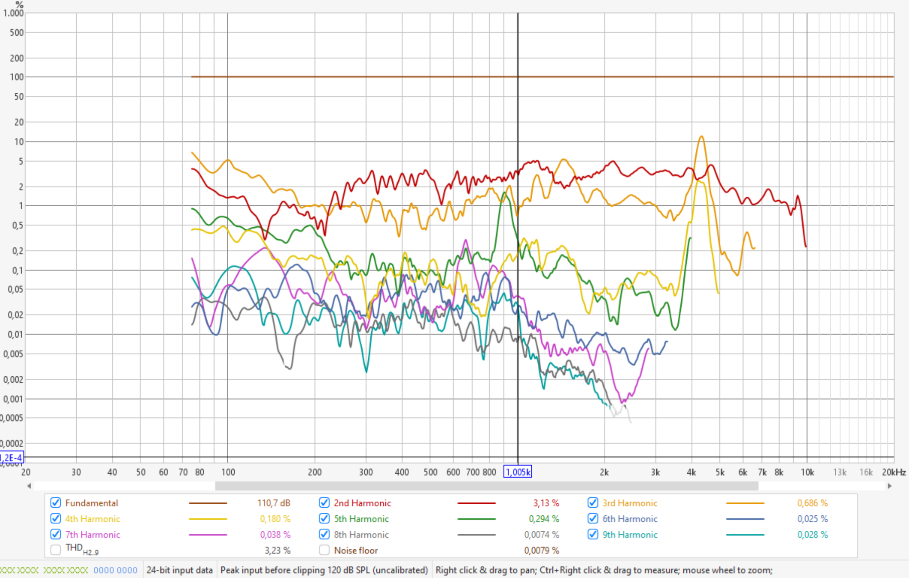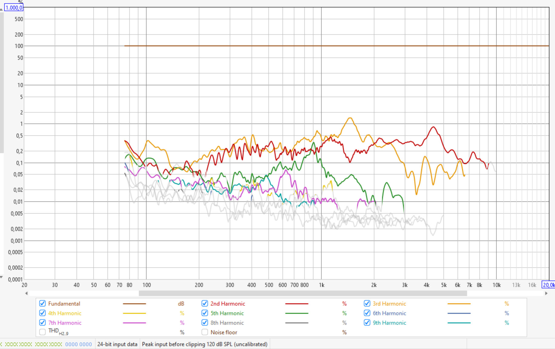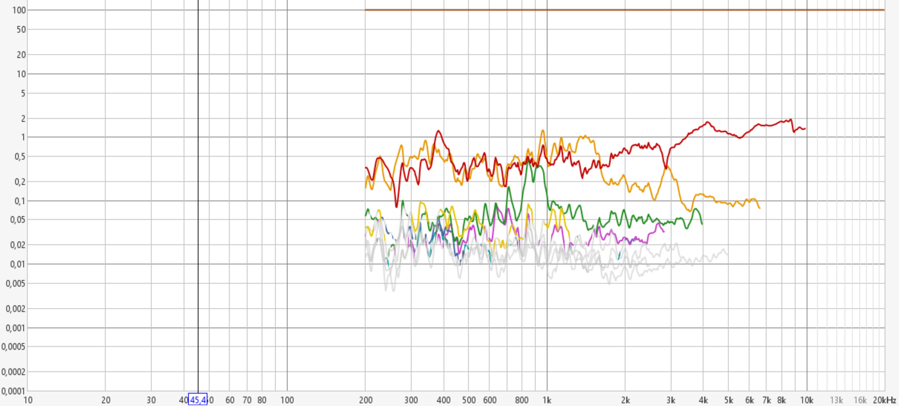 K2 kannst du sowieso vernachlässigen, da das bei Kompressionstreibern am Horn wie schon gesagt prinzipbedingt ist und kein Zeichen von Überlastung des Treibers ist. Musikalisch sind K2 Verzerrungen eine Oktave höher liegende Obertöne und daher im Ohr auch nicht unangenehm, nur ungeradzahlige Obertöne sind disharmonisch. Alle höheren Verzerrungswerte kann man ignorieren, da deren Niveau geringer ist als K2... K3 und sie auch schnell außerhalb des Hörspektrums liegen.