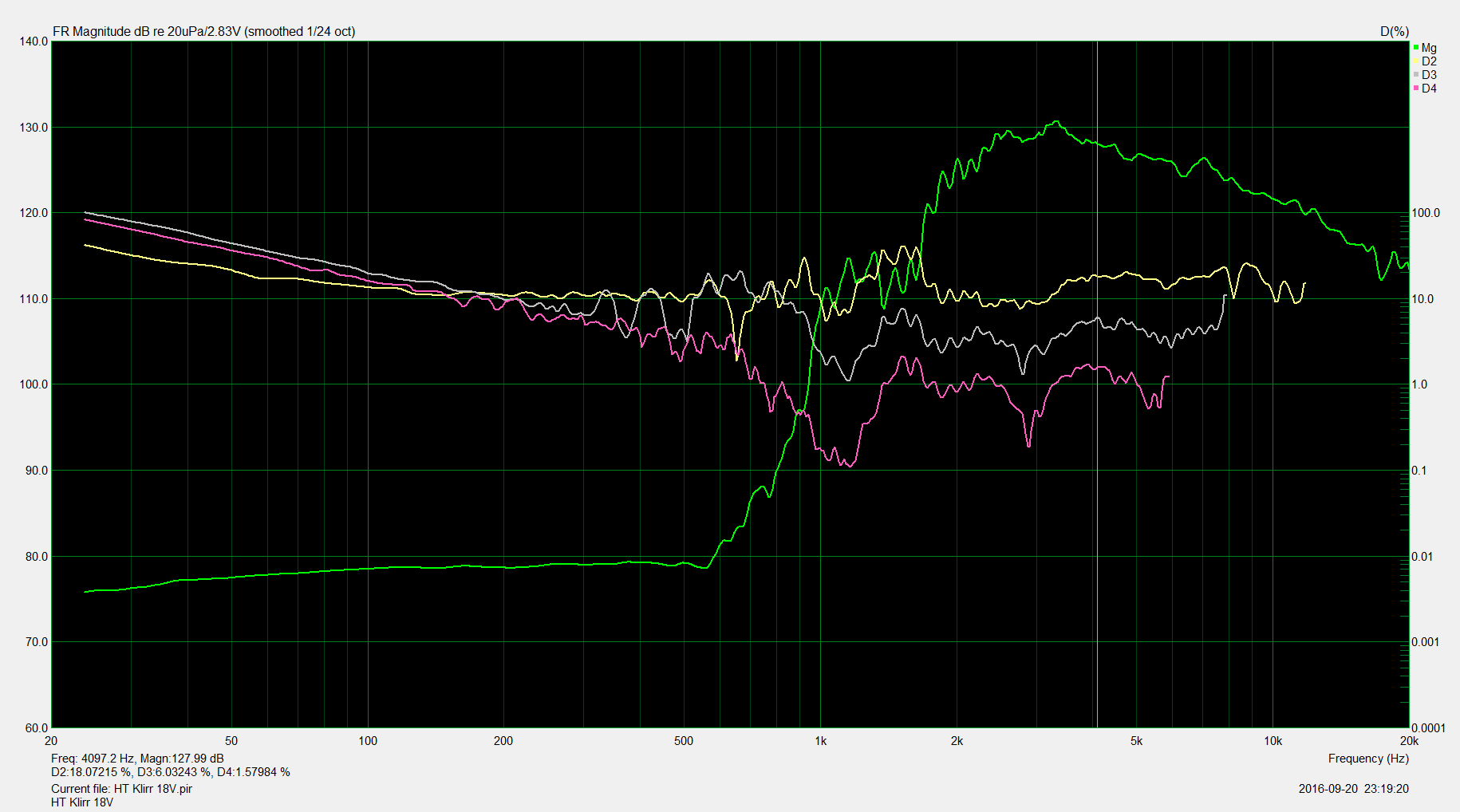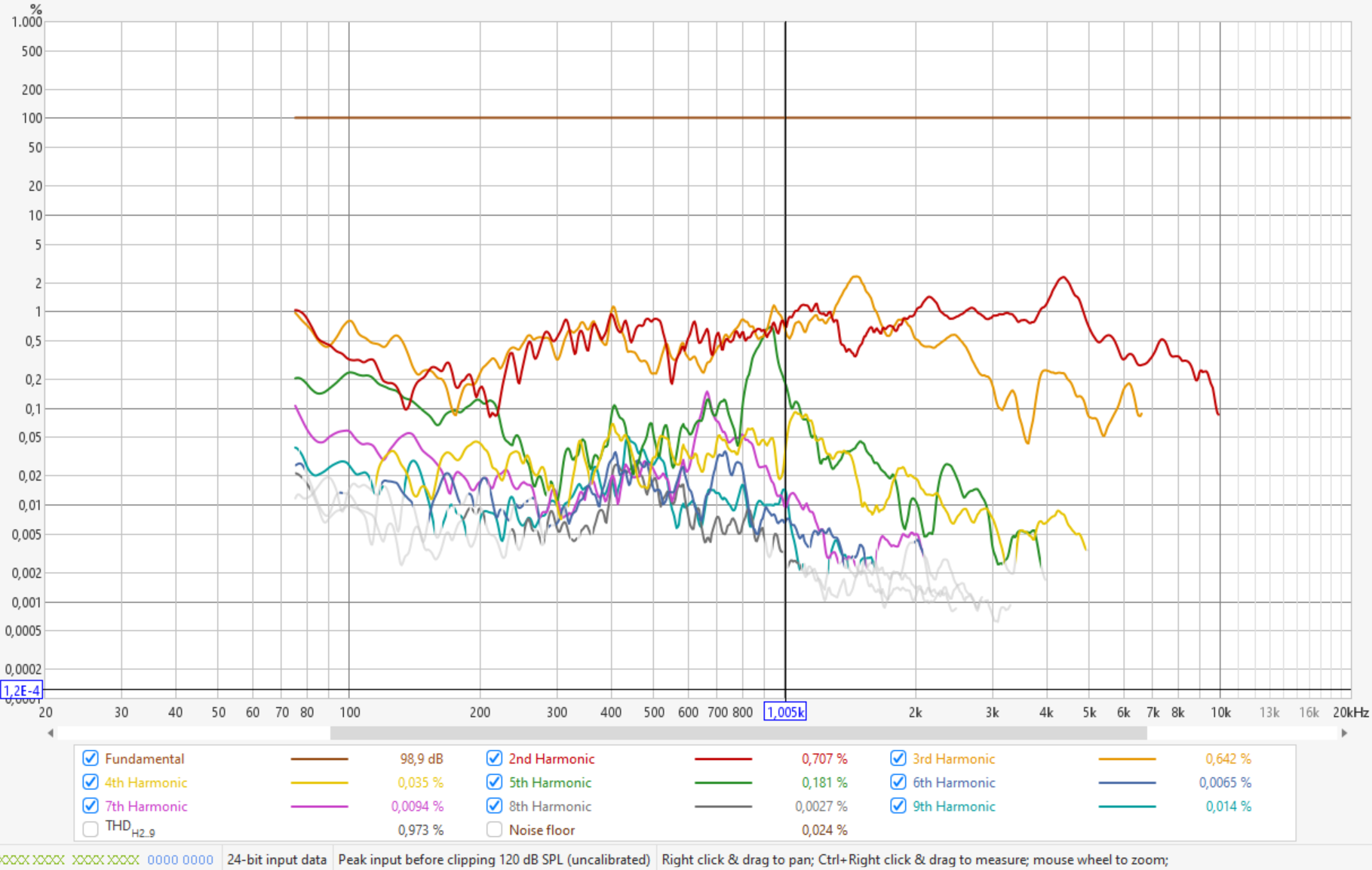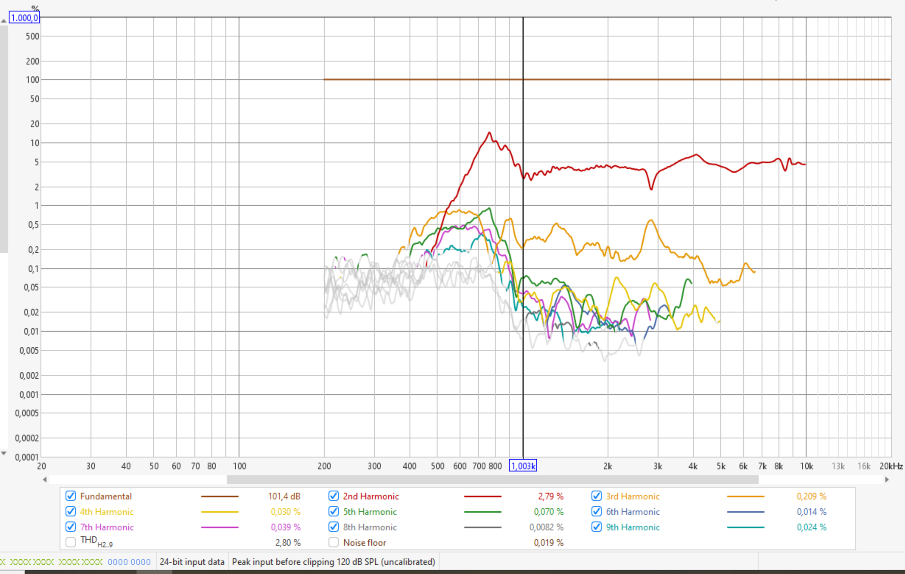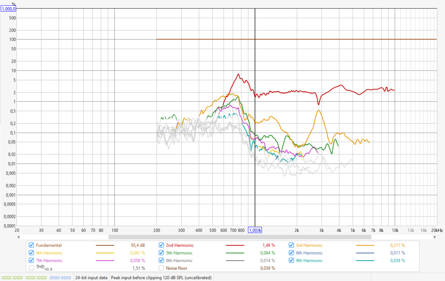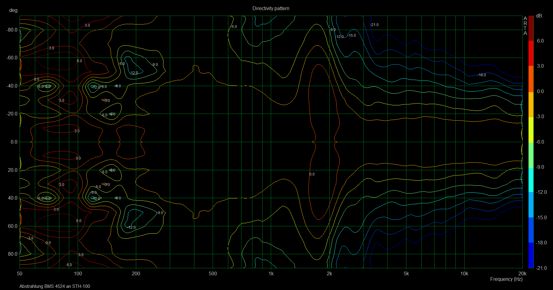 K2 kannst du sowieso vernachlässigen, da das bei Kompressionstreibern am Horn wie schon gesagt prinzipbedingt ist und kein Zeichen von Überlastung des Treibers ist. Musikalisch sind K2 Verzerrungen eine Oktave höher liegende Obertöne und daher im Ohr auch nicht unangenehm, nur ungeradzahlige Obertöne sind disharmonisch. Alle höheren Verzerrungswerte kann man ignorieren, da deren Niveau geringer ist als K2... K3 und sie auch schnell außerhalb des Hörspektrums liegen.