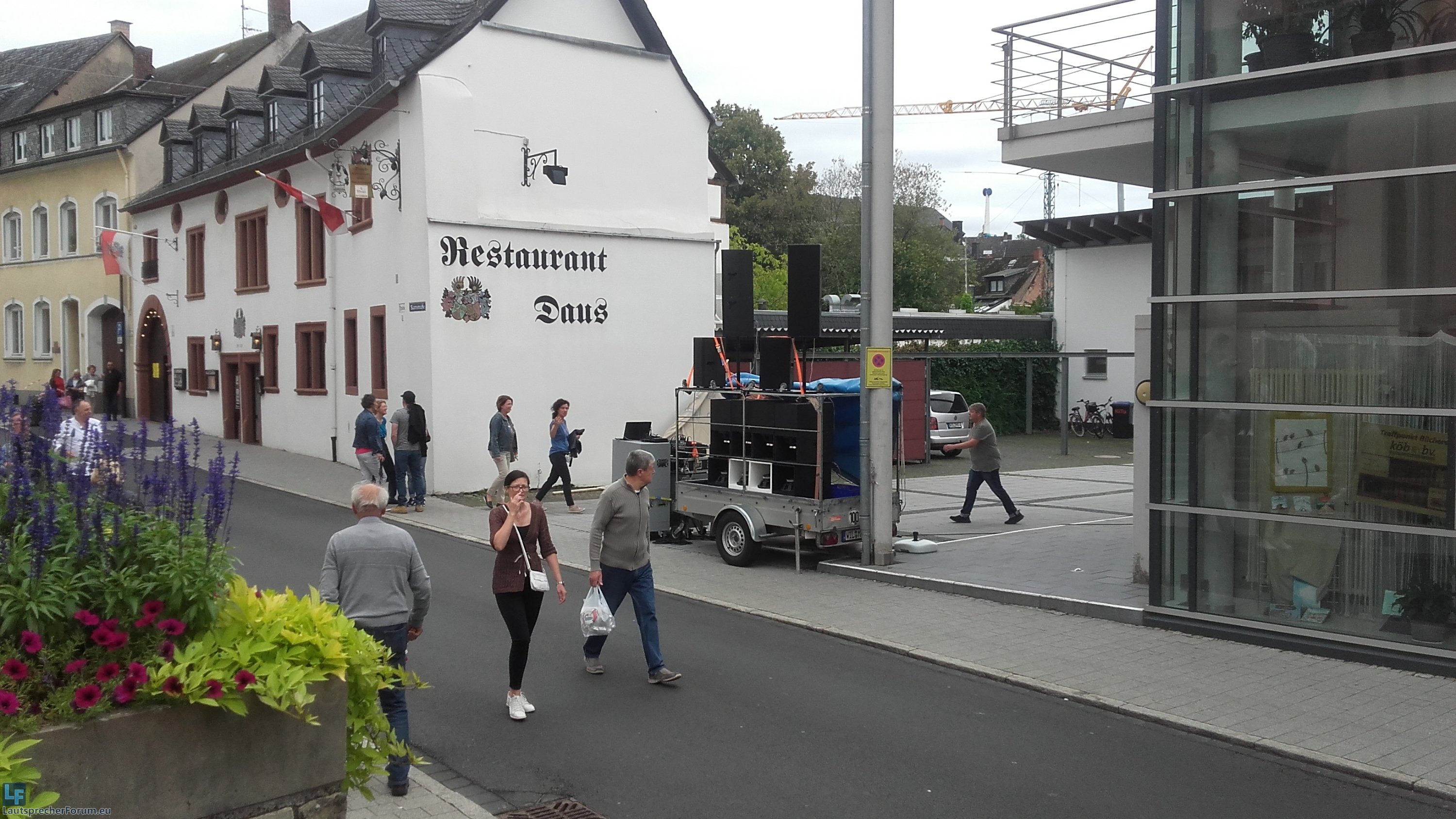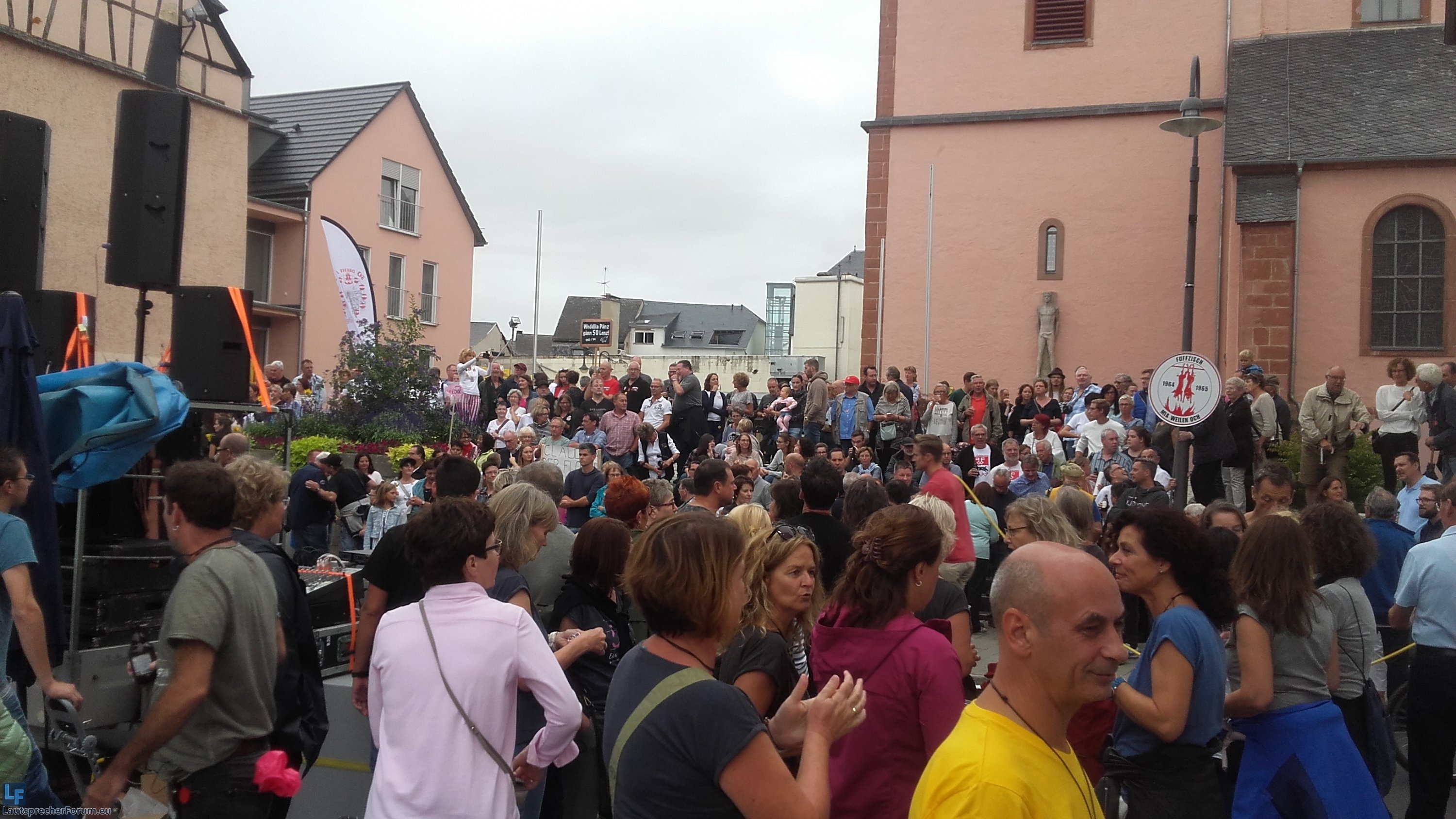 Es waren 3-4 Moderatoren auf der Straße und im Getümmel. Zwei mit Headset, zwei mit Handkeule, alles an einer 4-Kanal-„Billig-Funkanlage“ von Kirstein (habe ich an anderer Stelle berichtet). Einige normale Mikros lagen als Reserve am Pult (sowie im Kofferraum noch zwei Sennheiser Sets für den Notfall – aber das war „kontrabudget“..)