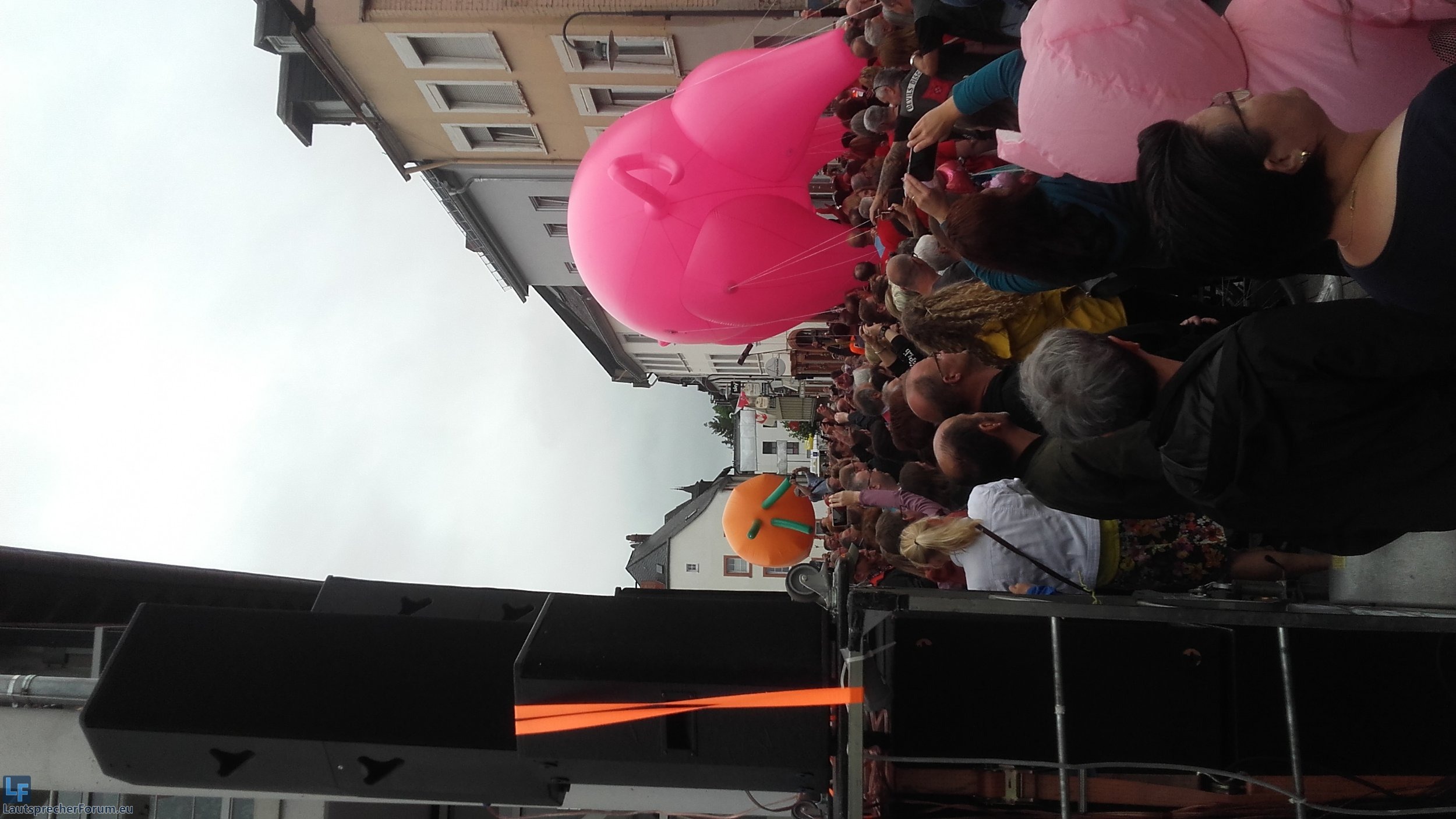 Die Jubilare wurden mit einem 6 Meter langen und drei Meter hohen fliegenden Schwein überrascht, mit dem sie dann durch die Stadt bis zum Marktplatz eine ebenfalls riesige Möhre verfolgen mussten (leitet sich aus Geschichte und Brauchtum ab, fand hier aber mal eine völlig neue Umsetzung).