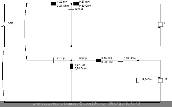 Mit kleiner Serienspule im Hochton - alles andere hat mir klanglich nicht gefallen und paralleler Kondensator drückt die Impedanz zu weit (und zieht bei 9khz zu viel, sodass manche S-Laute sehr dumpf klingen).