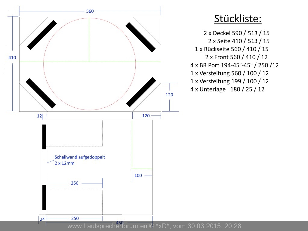 Tuning: 46Hz (mit Frontgitter, ohne 48Hz), 288cm², 4 x Eckports 12 x 12cm / 27,4cm Länge inkl. Schallwand