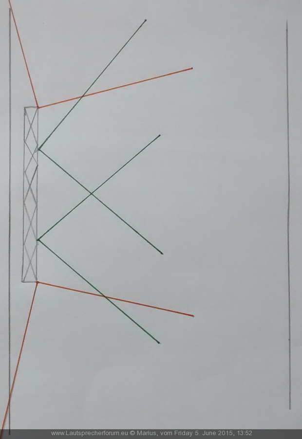 Die Gasse ist nur 10 bis maximal 15m breit. Das Rote ist eine Traverse an der Lautsprecher und Licht geflogen werden. Auf der linken und rechten Seite stehen Häuser (10m ca.). Beschallt werden soll 180°. Ich habe folgendes Material zur Verfügung: