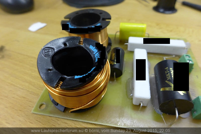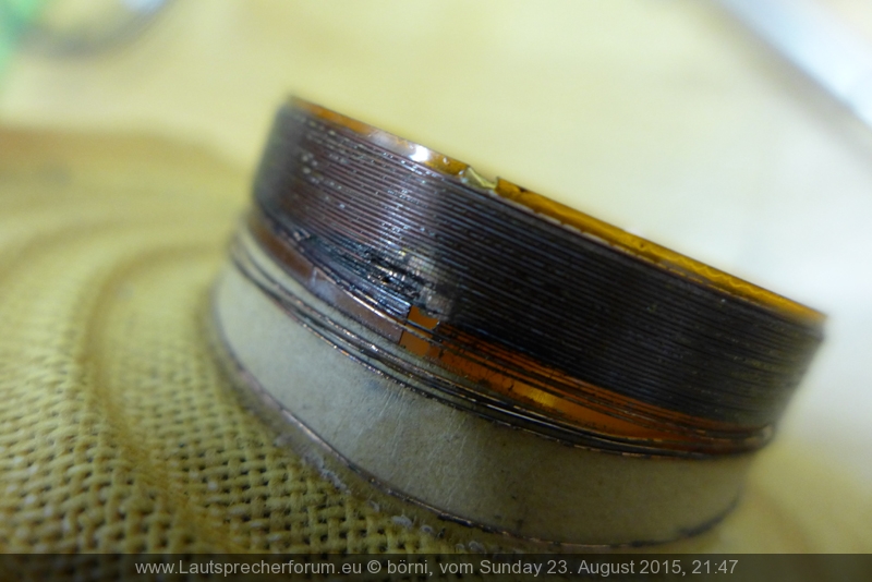 Hab nach diesem Befund das andere JL-sat6 auch aufgeschraubt und die Frequenzweiche begutachtet. Schließlich sind die beiden Topteile 1:1 Aufgebaut und hingen auf demselben Endstufenkanal. Der Wickelkörper zeigt auch Anzeichen von leichter Verformung, aber eben nur Anzeichen und keine sofort ersichtliche Verformung.