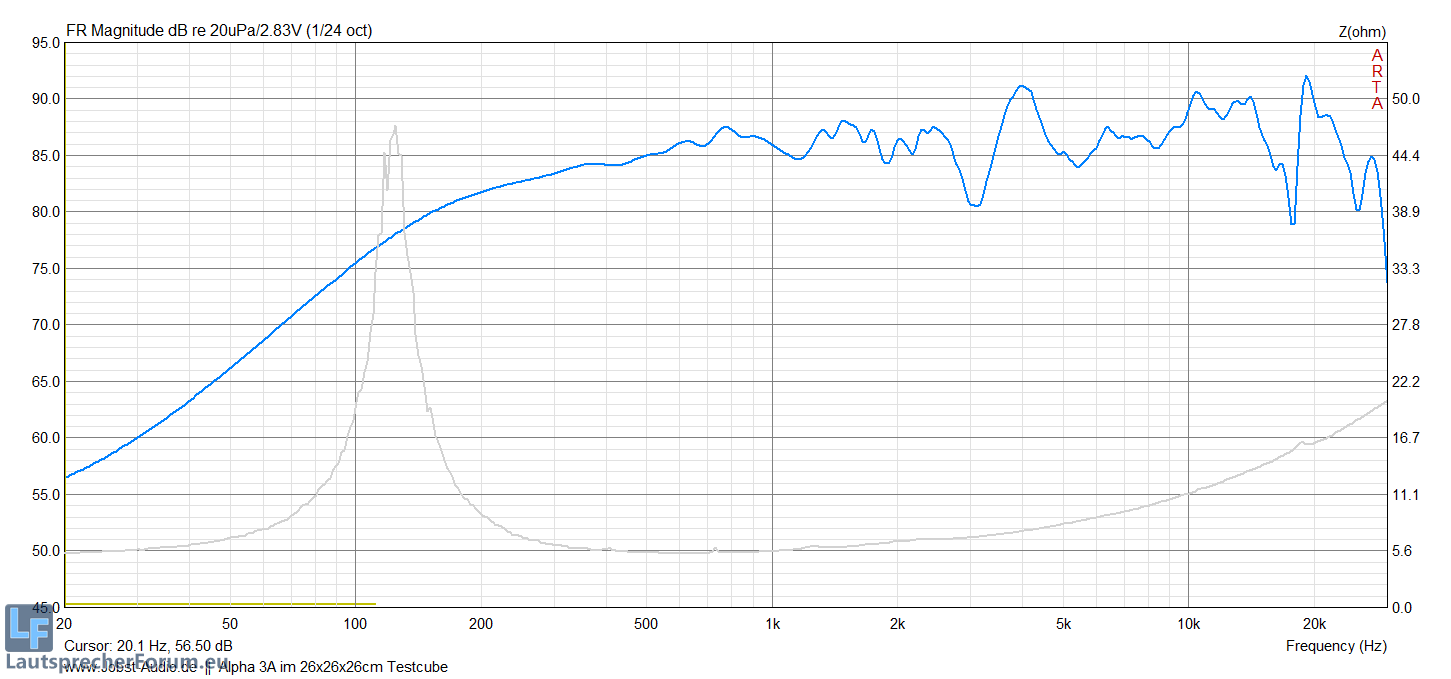 Den Frequenzverlauf habe ich nur kurz in einer kleinen 27x27x27cm Box gemessen, 0,5 als auch 1m Entfernung.