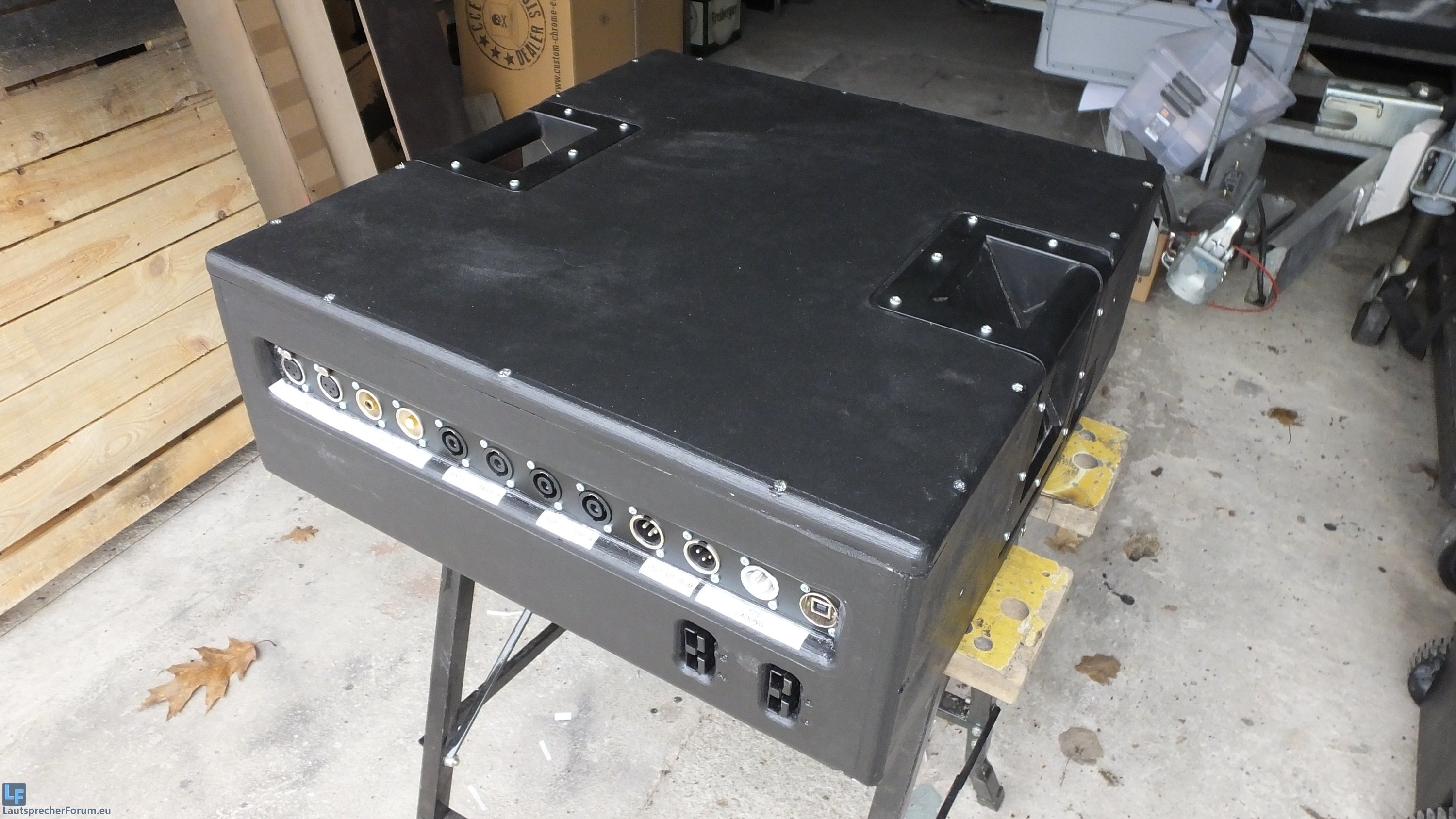 Der erste Testaufbau mit 2x 12" Tappedhörner (Rotth.TH12 --> B&C 12PS100 in 4 Ohm) und 2x Achat 110 (+Modweiche)