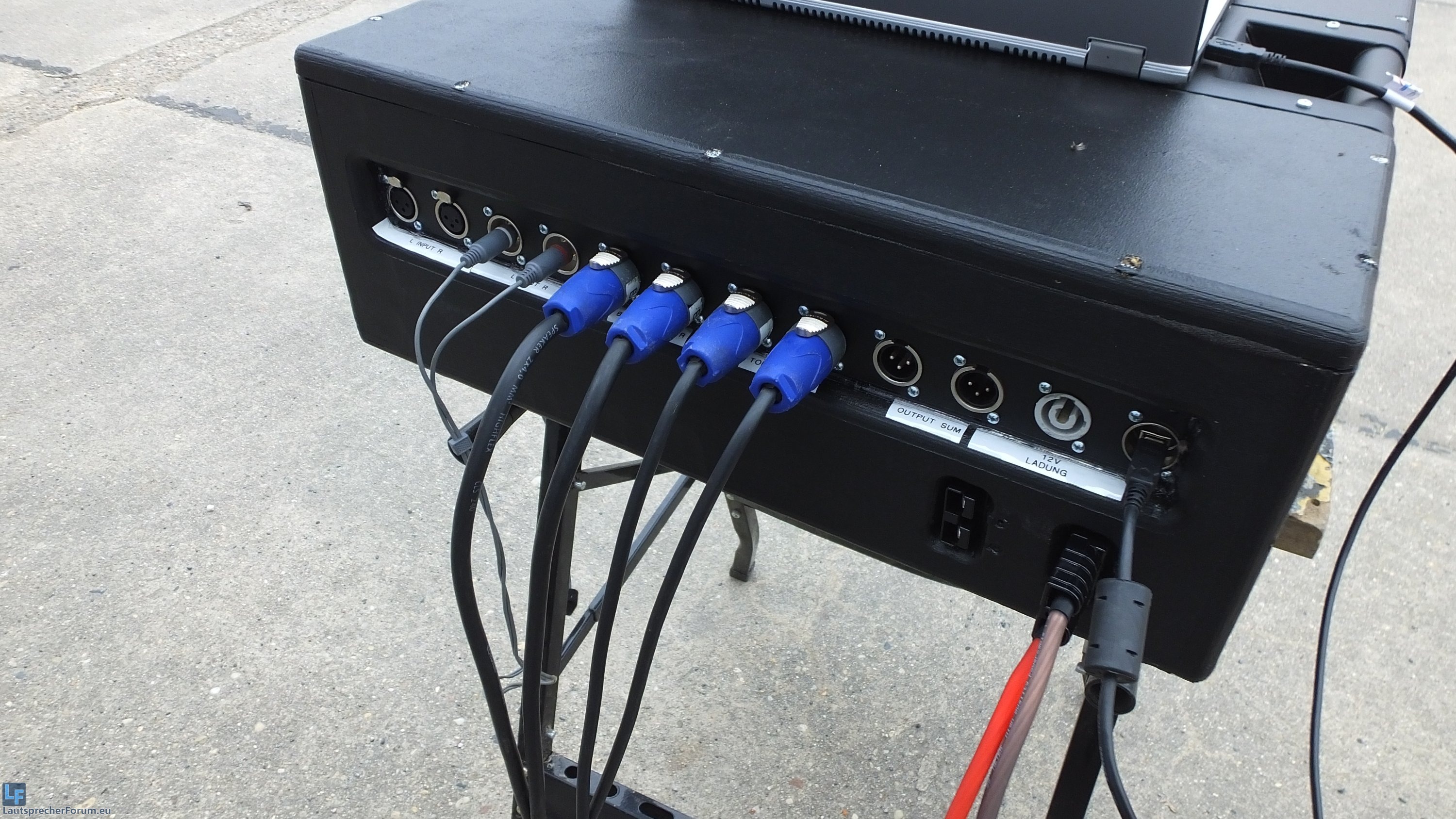 - Anschlussfeld: XLR + Chinch Input, Speakon Out, XLR Out (Kanal 5/6), 12V Ladebuchse, USB für DSP