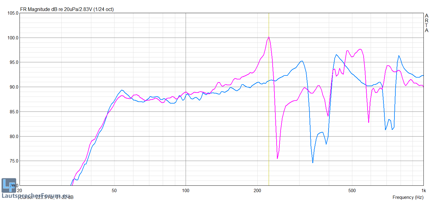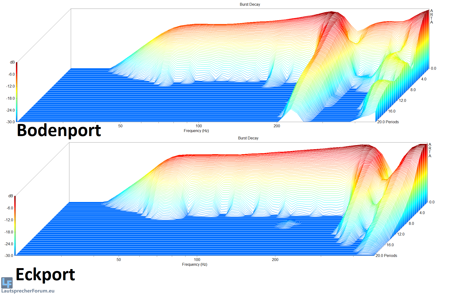 Wir sehen, dass der sehr große Bodenport seine Resos knapp eine halbe Oktave tiefer hat, als auch 5dB mehr ausschlägt.