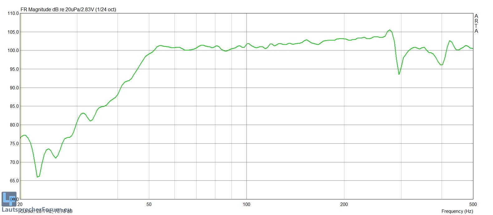 Die Resos habe ich sehr gut in den Griff bekommen und treten erst gegen 285Hz ein, sind zudem auch nicht sonderlich ausgeprägt.