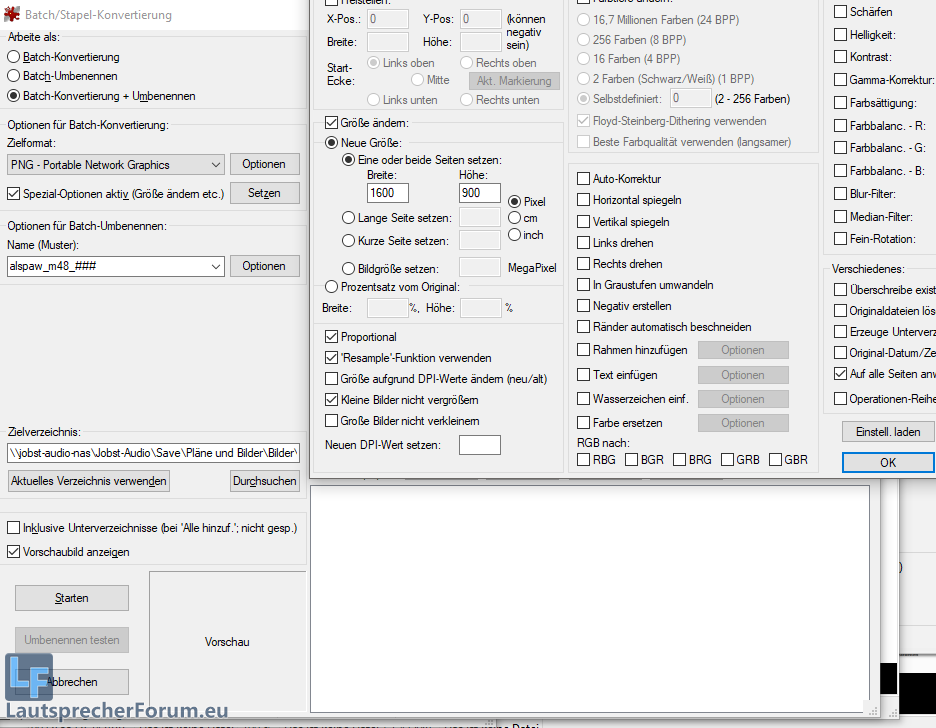 "Setzen/Spezialoptionen" sehen wir im Bild rechts, Größe Auswählen und die 3 unteren Haken setzen (Proportional, Resample & Kleine Bilder nicht vergrößern)