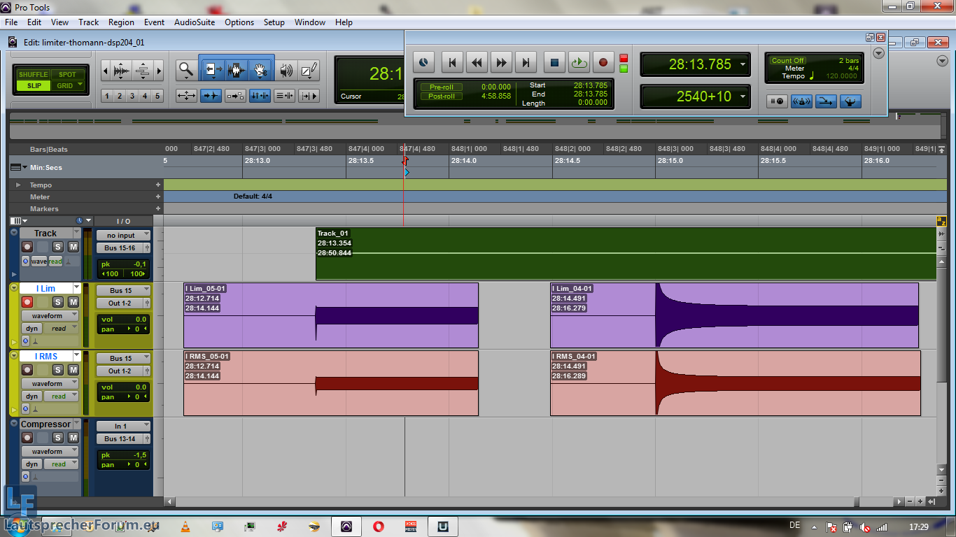 Ich habe den Limiter und Kompressor, mit identischen Settings (1ms/limit/500ms/-6dBu) gegenüber-gestellt,