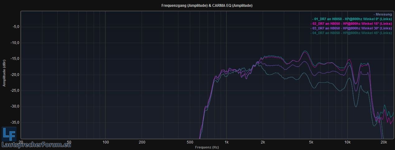 Hab dann direkt den DR7 eingebaut und der sieht zwar auch nicht wie ein Babypopo aus, aber doch etwas gleichmäßiger bis auf den Peak bei 4,5 kHz. Die Abstrahlung unter Winkel sieht doch auch recht gleichmäßig und brauchbar aus ab 2kHz. @Jobsti, du hattest Bedenken wg dem Celestion H8050 Horn; erkennst du die in der Messung wider?