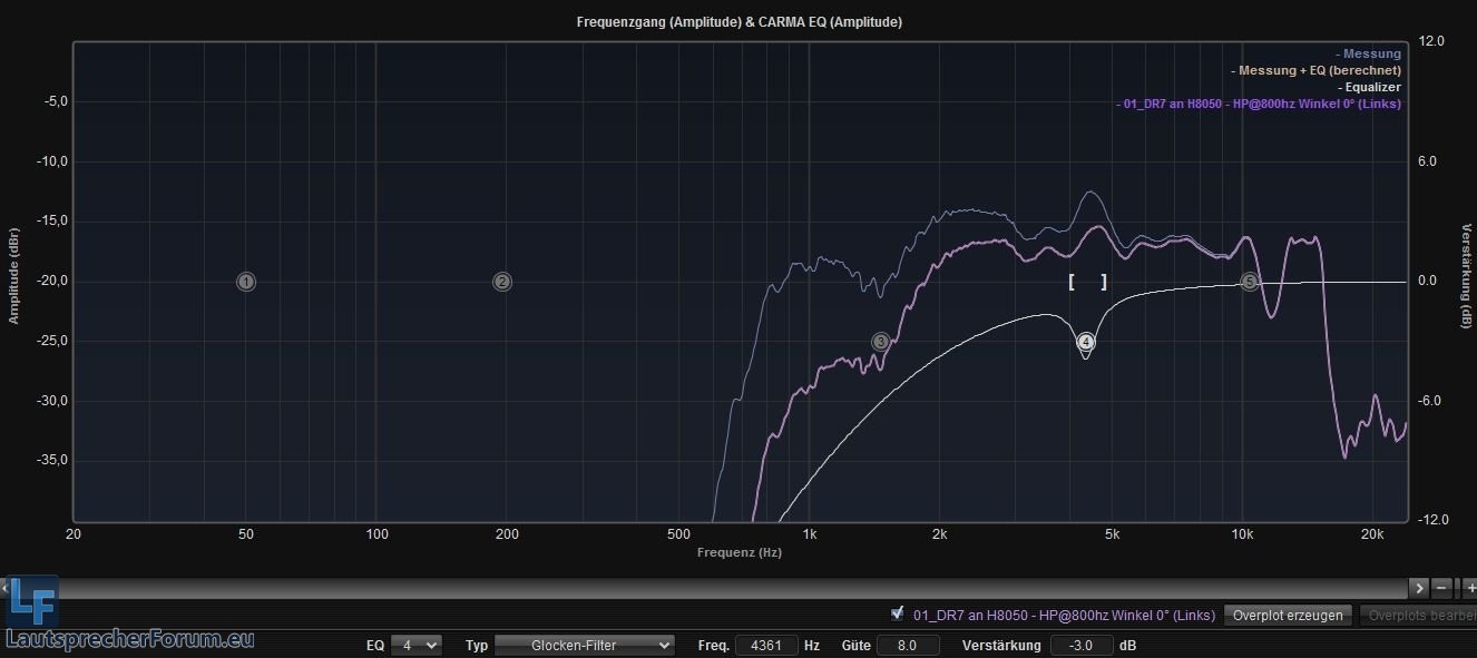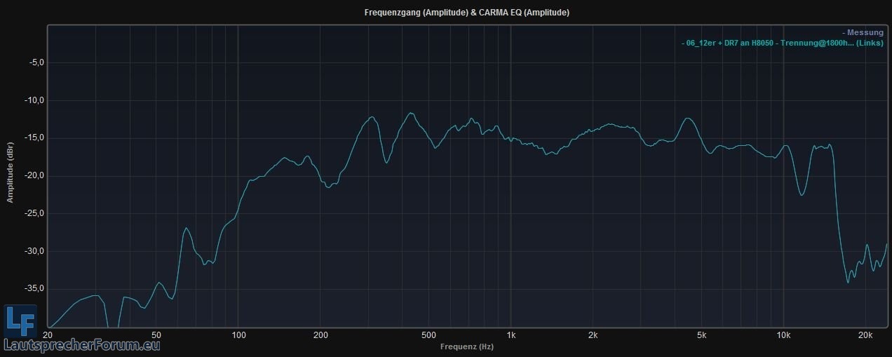 Zu Letzt hab ich etwas mit den Filtern gespielt und so sähe der DR7 am H8050 im Gehäuse aus mit einem Hochpass 2.Ordnung @1,5Khz mit einer flachen Güte von 0,5 und einem Saugkreis bei 4,4kHz mit Güte von 8 und -3dB