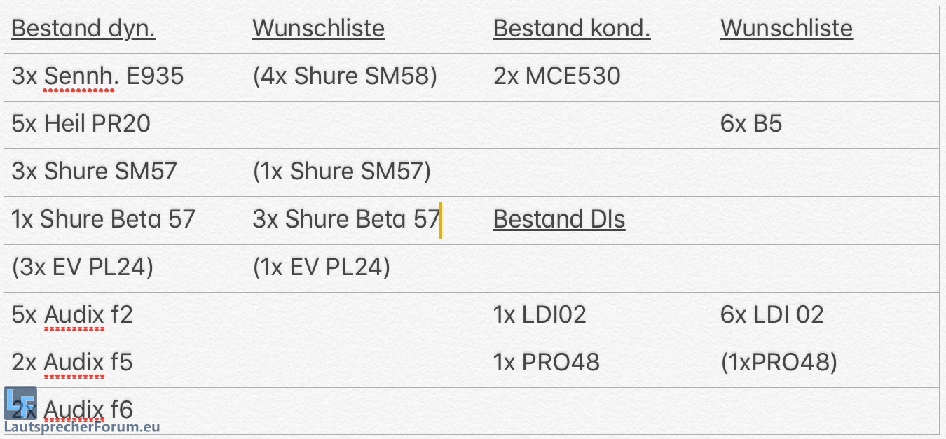 im Anhang seht ihr eine kleine Auflistung eigener Mikrofone. Zur Erweiterung werden ein paar Empfehlungen gesucht.