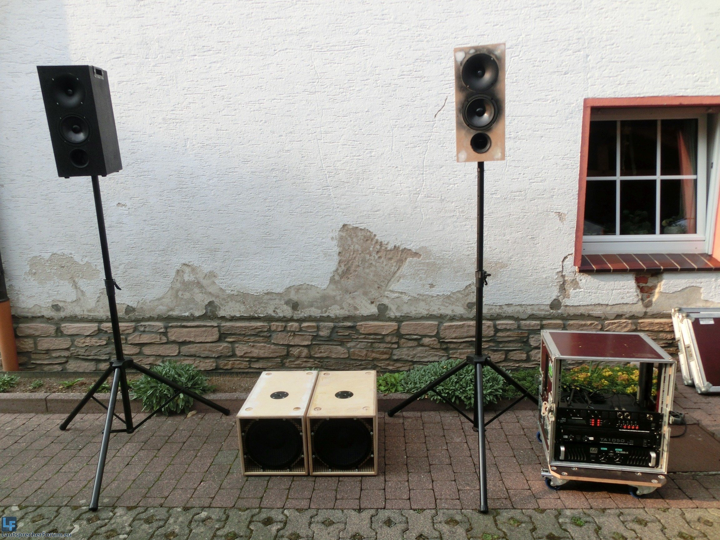 Das ist alles was ich bis jetzt habe, und so wie es auf dem Foto zu sehen ist wird es normalerweise auch aufgebaut. Meine Selbstbau 6" auf Stativ links und rechts neben zwei LF-Sub12W.
