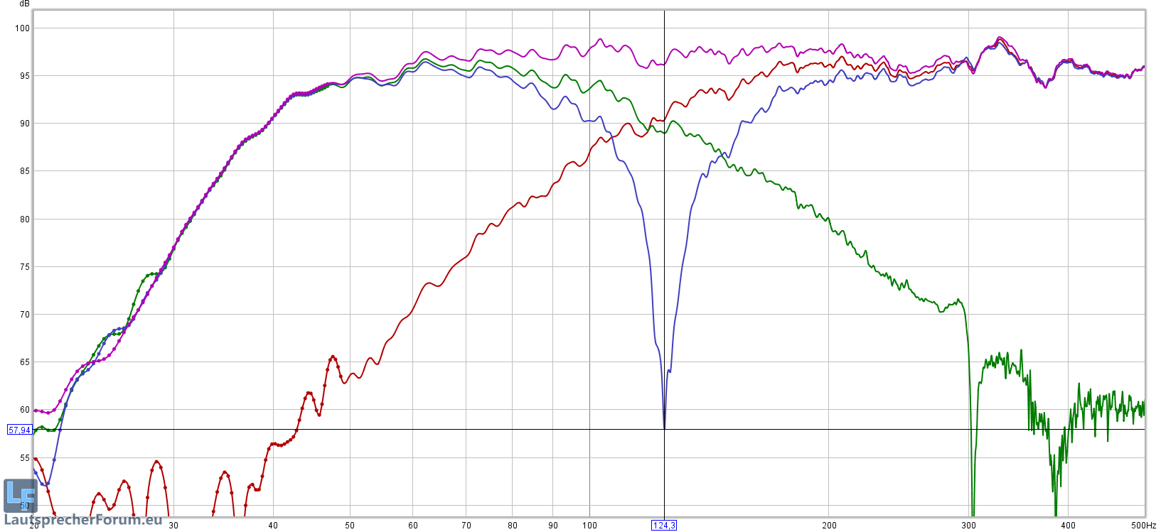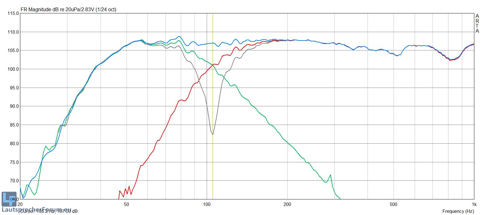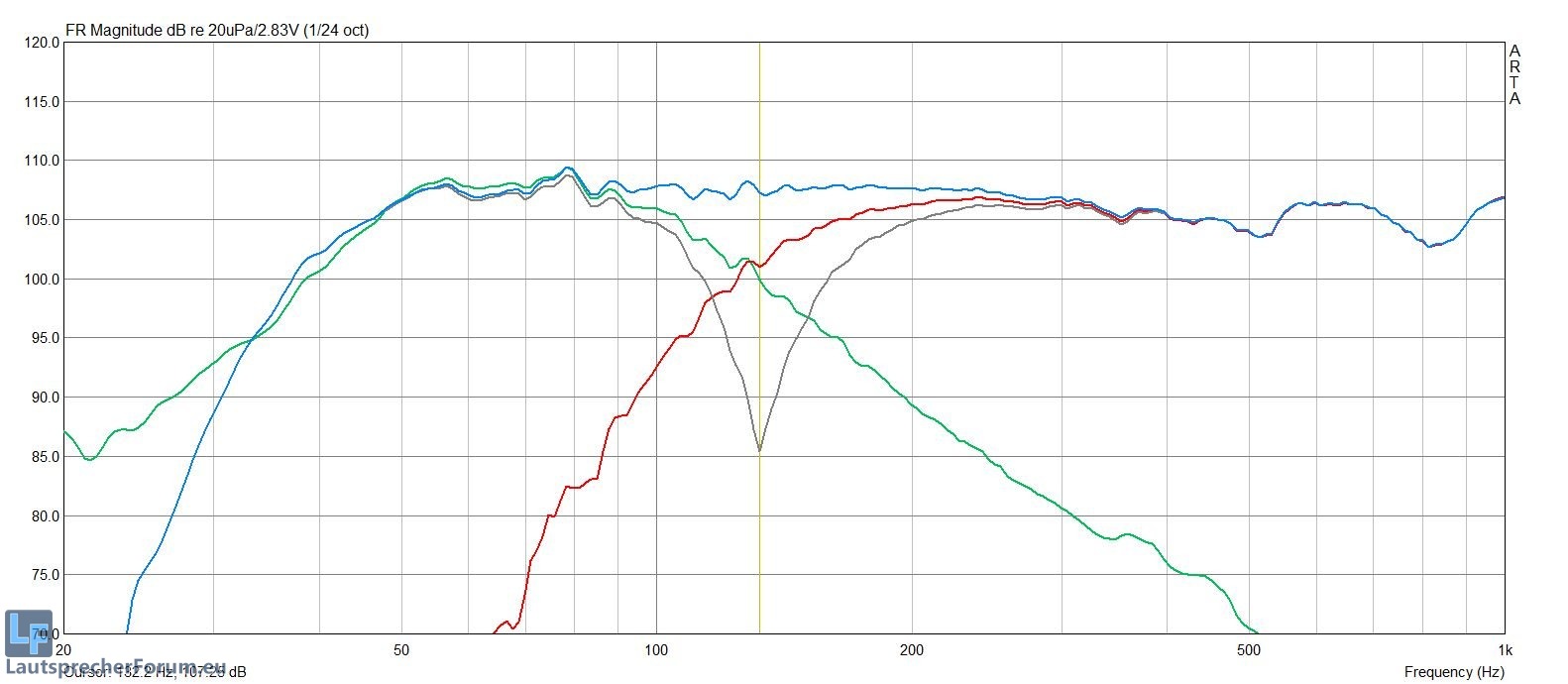 Dann habe ich nochmal am Setup was verändert, sieht jetzt so aus, Trennung ist nen bisschen tiefer als die angepeilten 130hz aber so hats die beste Auslöschung gegeben.