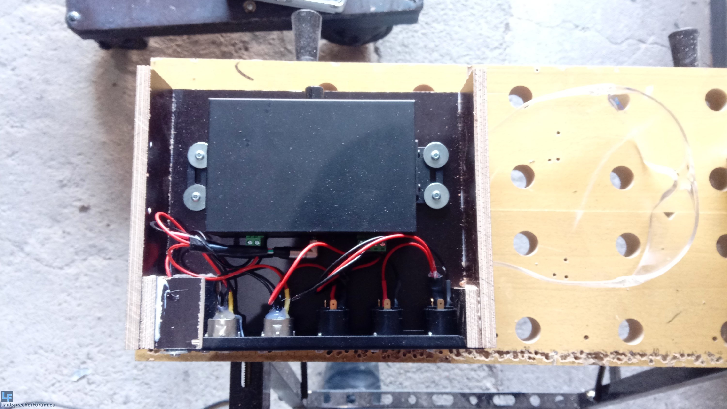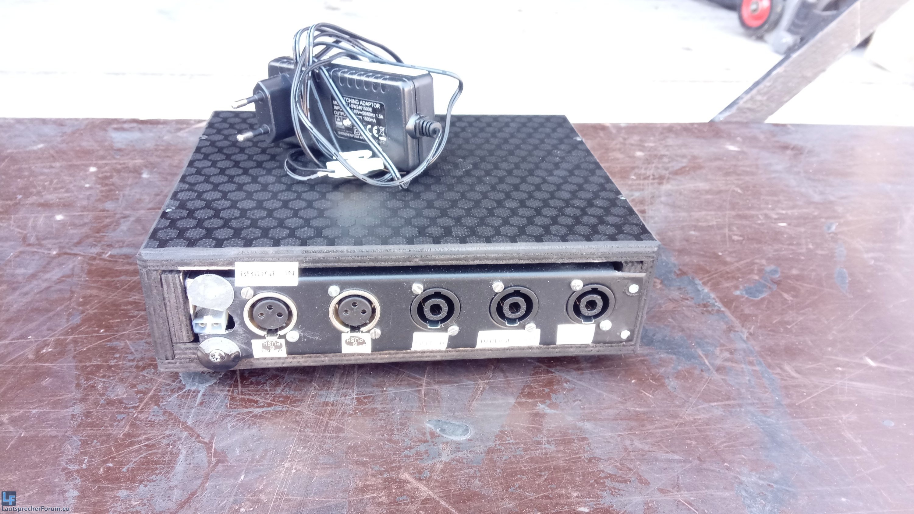 Wie man sieht habe ich XLR Inputs und Speakon als Out verbaut. Damit ist das Teil geschützt und fix und fertig betriebsbereit