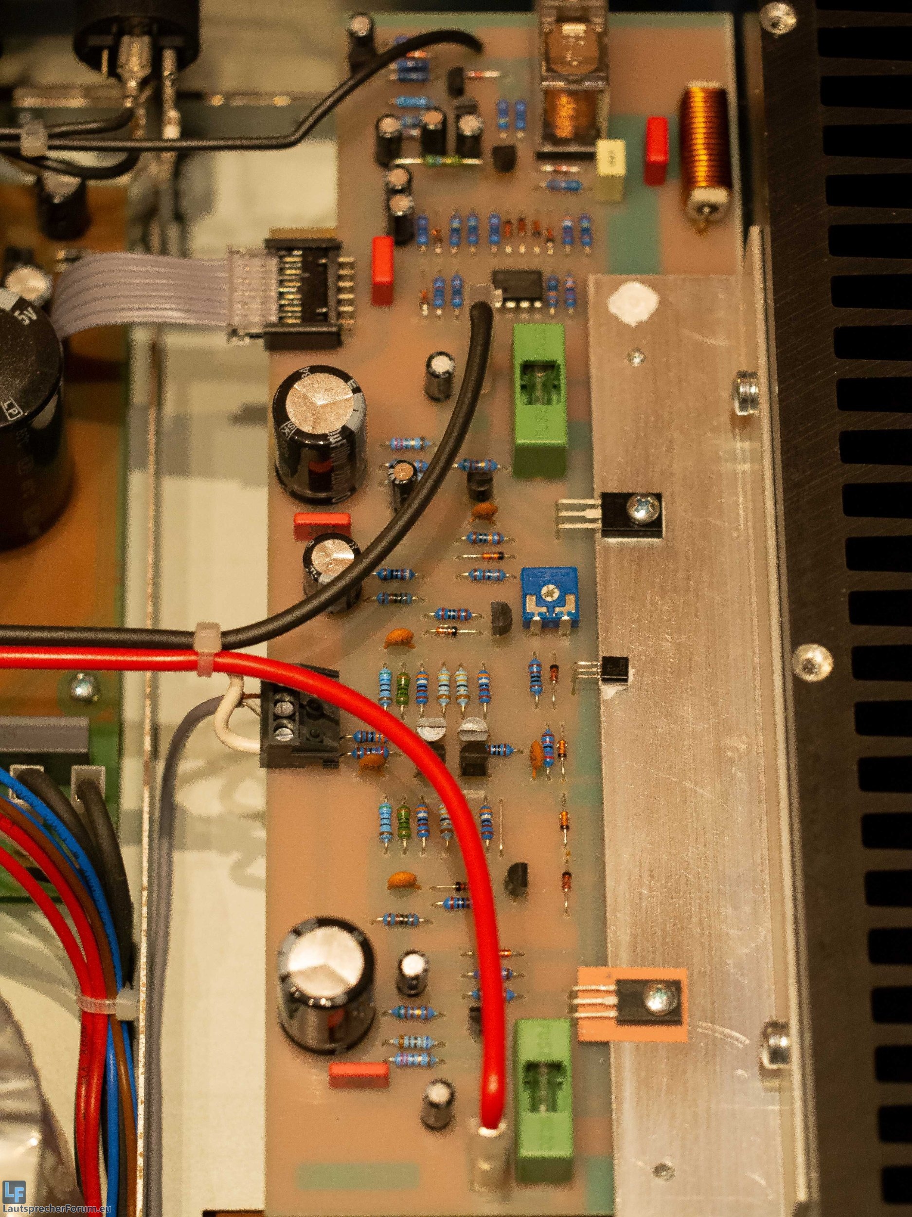 ich habe zwei gebrauchte PAS 2002PCA erworben und habe mir dann das Innenleben mal angeschaut. Dabei sind mir zwei Potentiometer (auf dem Bild in Blau) in der Nähe der Transistoren aufgefallen. Diese waren alle auf einen anderen Widerstand eingestellt. Bei dem einen Verstärker lag der Wert vom linken Kanal bei 20Ohm und vom rechten Kanal bei 70Ohm. Bei dem anderen weiß ich es nicht mehr genau, war aber unter 50Ohm jeweils.