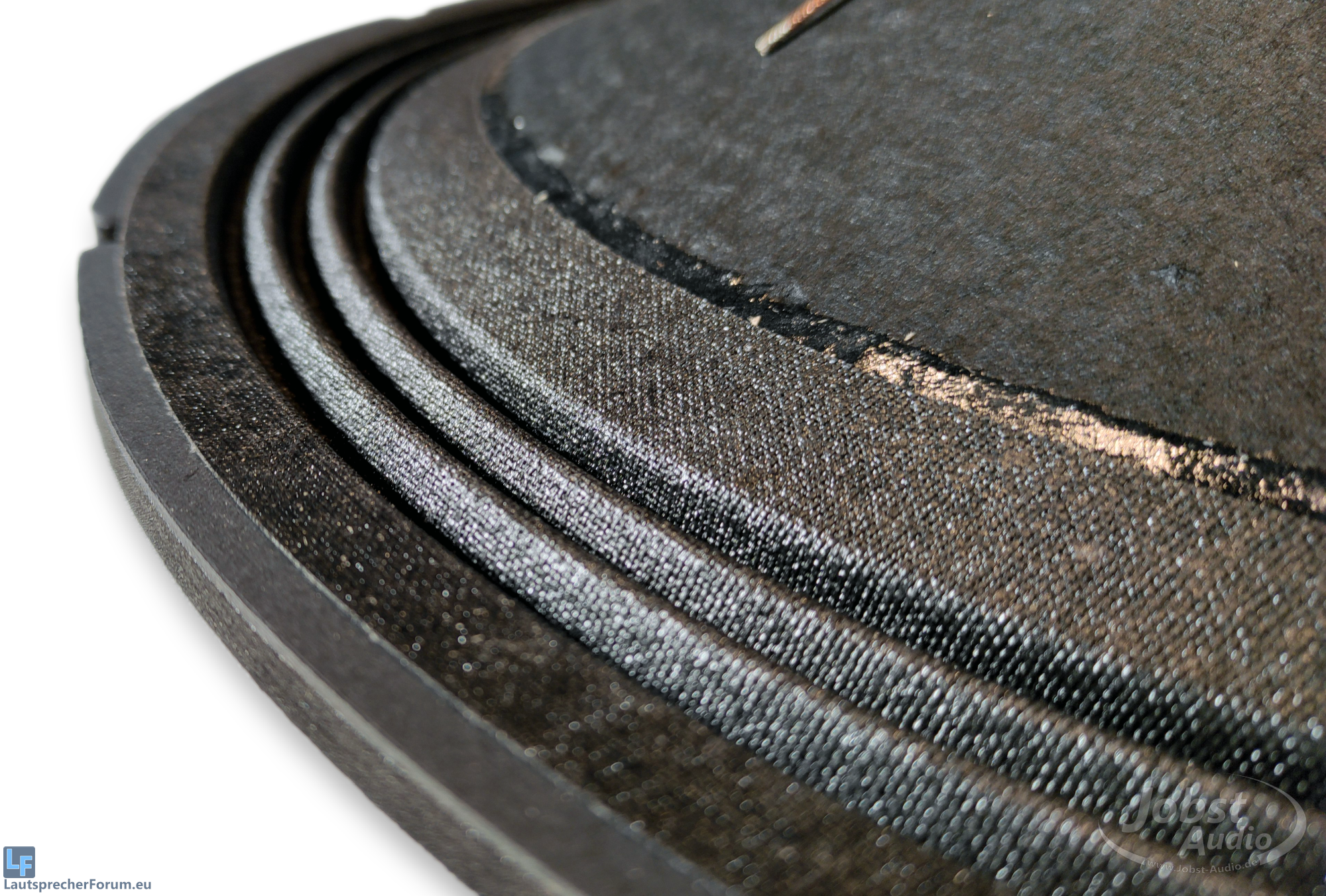 Oben sehen wir die Aufhängung der Membran per Sicke am Korb, samt vorderer Dichtung.