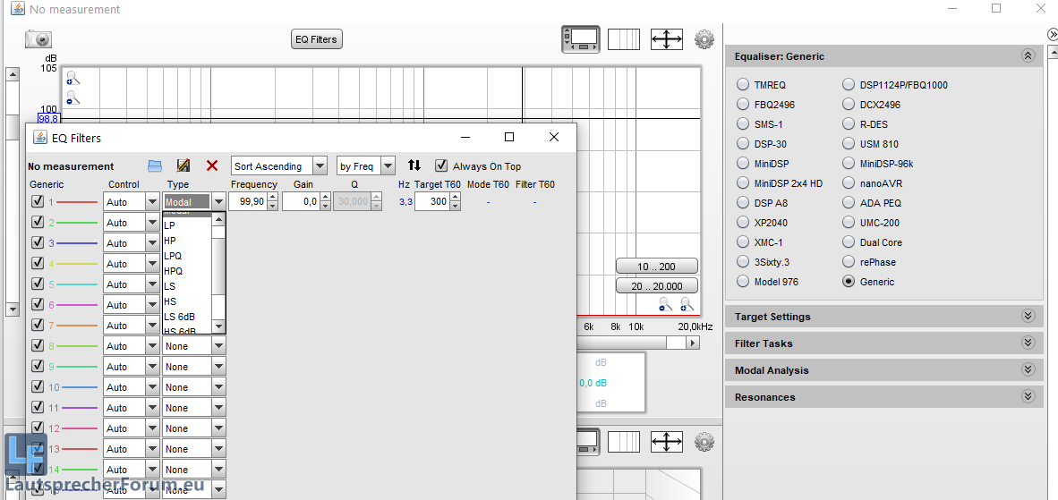 Also REW kann deutlich mehr als nur HP / TP. REW zeigt immer nur die Filter an die das Gerät das du bei "Equaliser :" ausgewählt hast auch wirklich kann. Wenn man auf Generic stellt hat man eine lange Liste mit so ziemlich allem was das Herz begehrt.