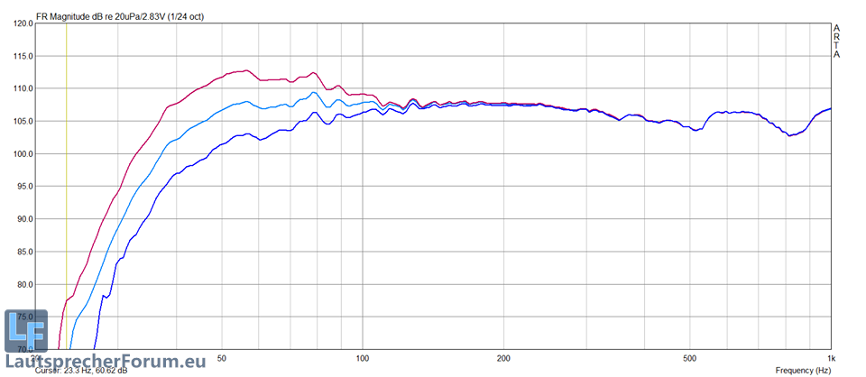 Z.B. Datenblatt 103dB Halbraum, aber in der Messung lesen wir im Mittel zwischen 50-100Hz (wir denken uns schon mal, dass ein TP draufsitzt) aber 101dB.