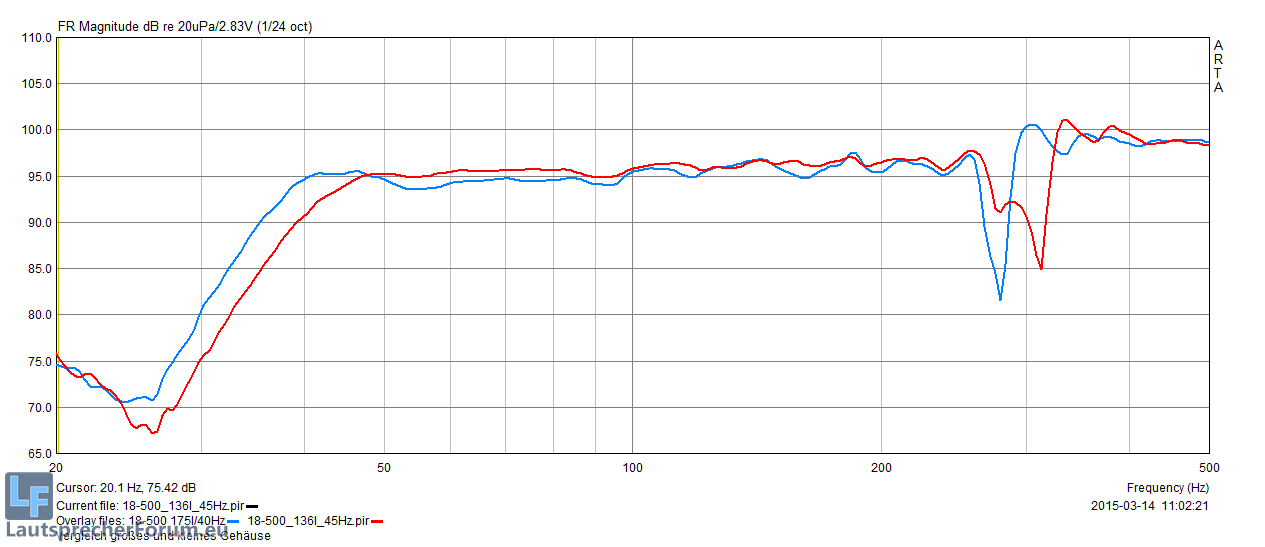 Bitte dazu aber nicht nur die Simu, sondern auch die Messungen beachten. Ich poste sie mal direkt, damit sie auch gesehen werden - rot Sebb's 136l/45Hz, blau die 175l/40Hz Variante:
