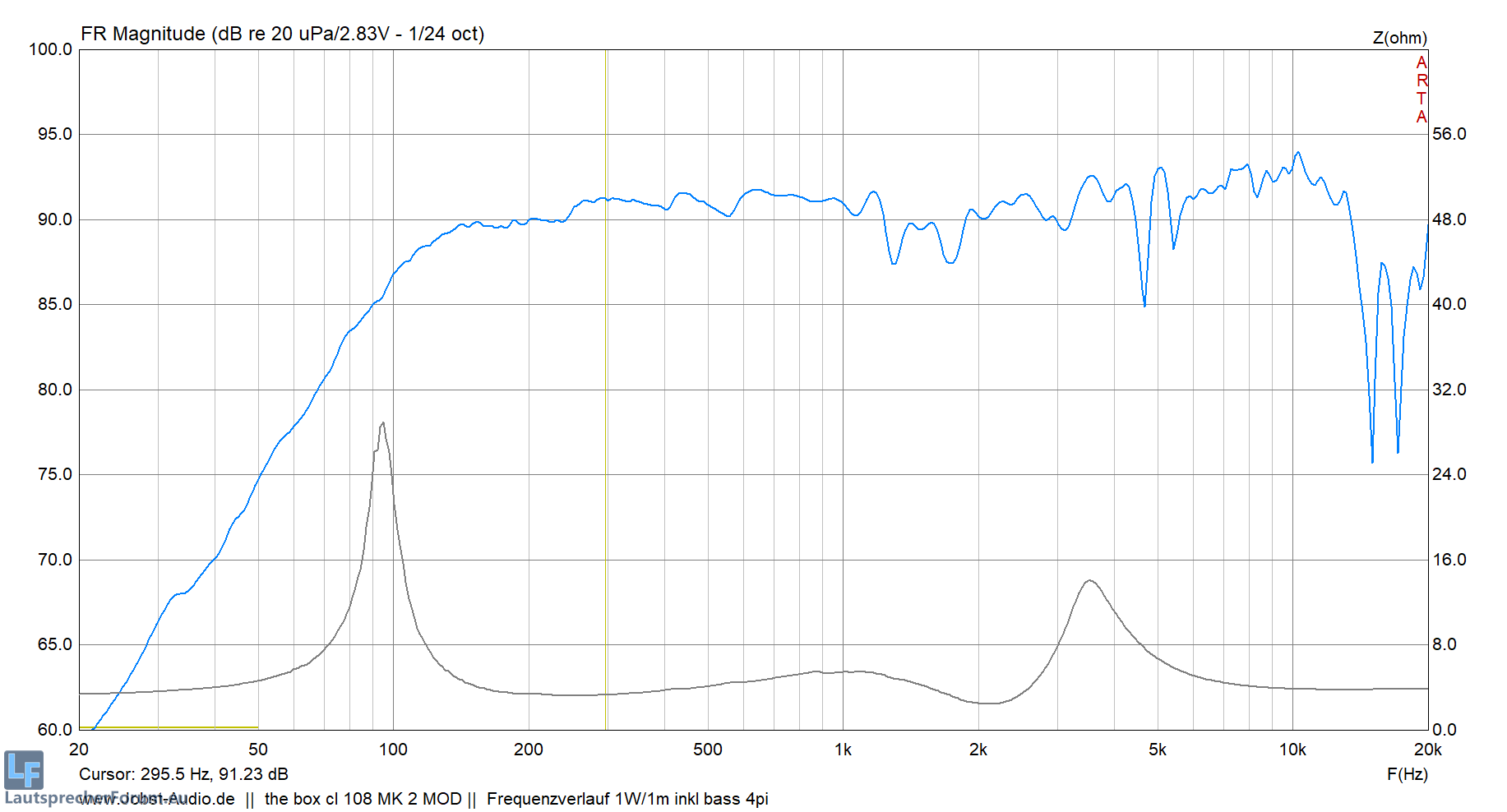 Ebenfalls sind wir von der Impedanz wieder voll im Grünen Bereich als reine 4 Ohm Box nach Norm, mit Zmin 3,21 Ohm.