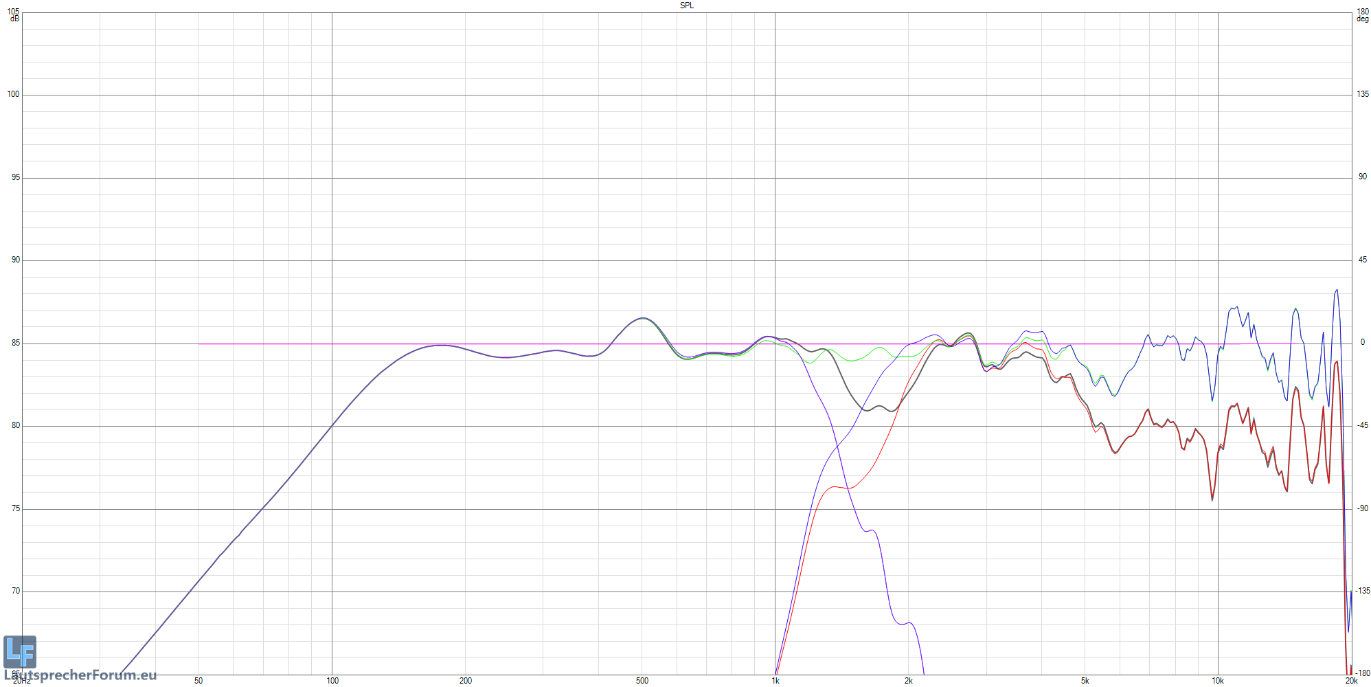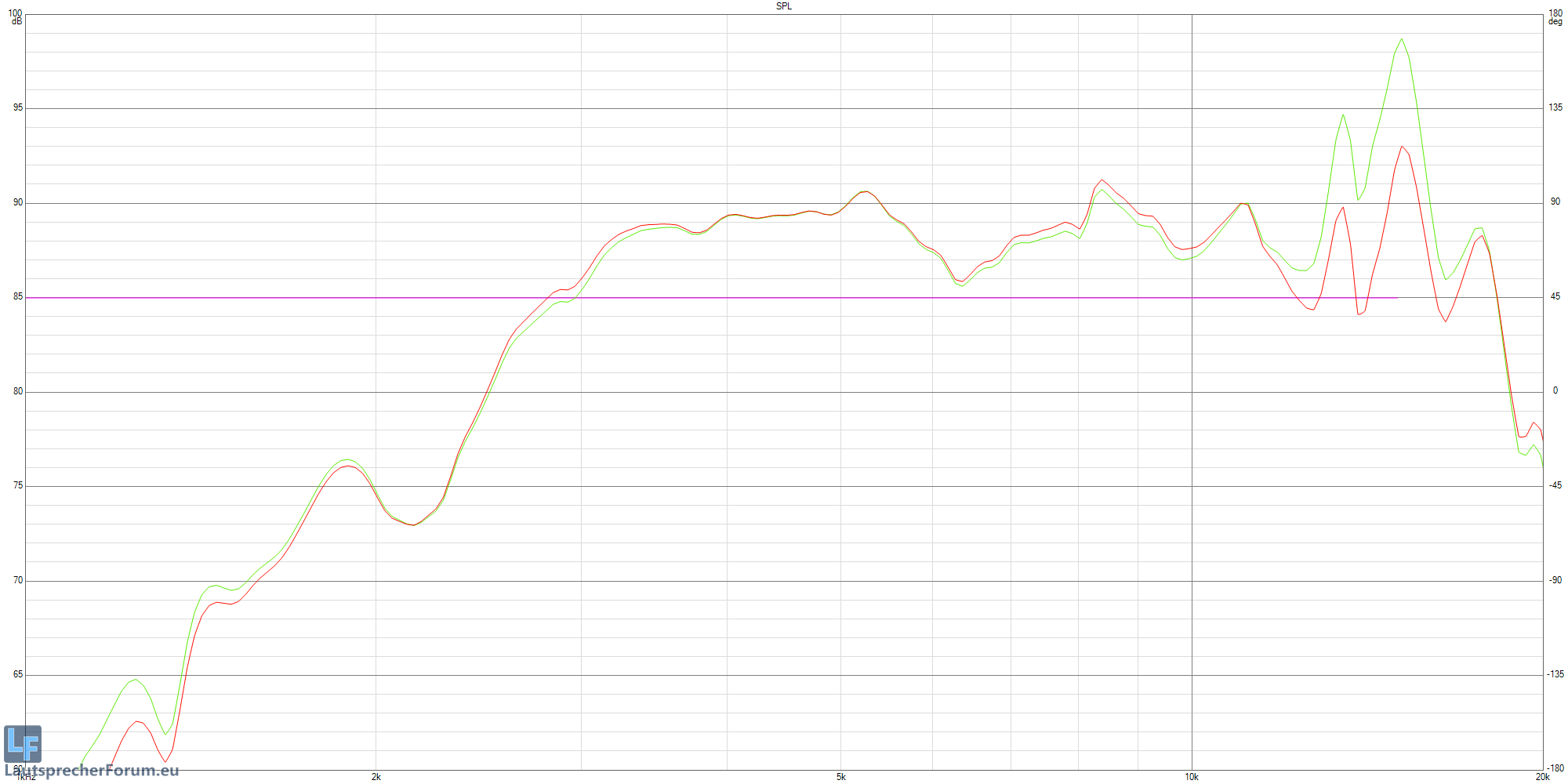 In Schwarz sehen wir den Gesamtverlauf mit Soffitte @20V mit Verlauf des Hochtöner in rot.