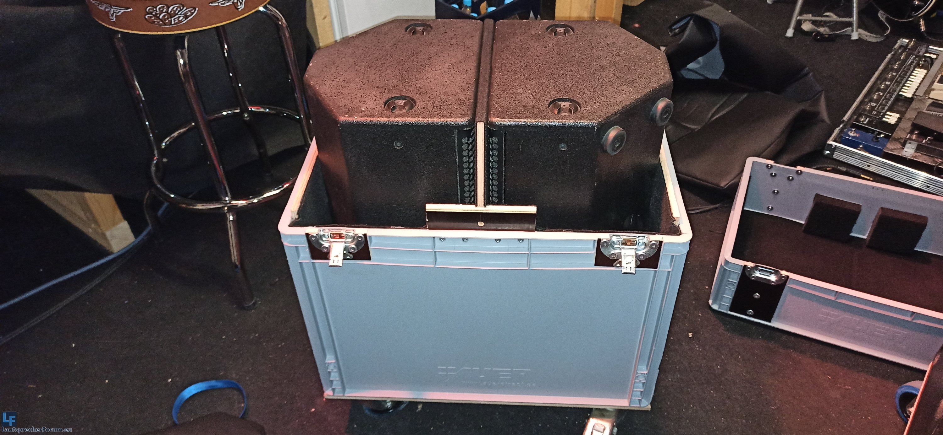 Hier mal ein Paar Bilder dazu: Im Endeffekt sind es zwei Kisten von Auer die mit Butterflys ausgestattet sind und mit etwas 9mm Siebdruckplatte verstärkt und ausgebaut wurden.