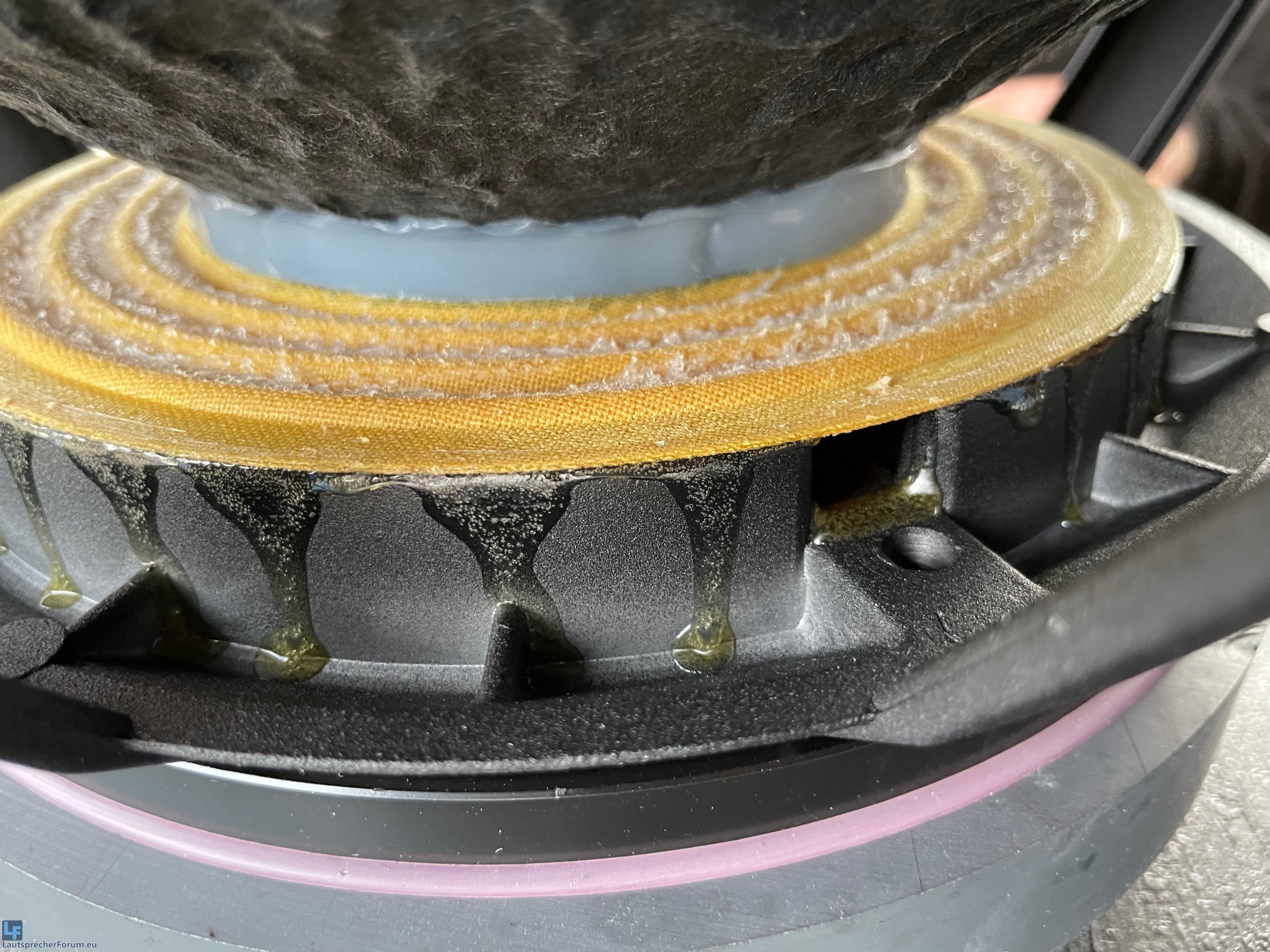 Beim auspacken sind mir Klebereste auf der gelben Sicke im unteren Teil des Lautsprechers aufgefallen (ich weiß leider nicht wie die heißt)