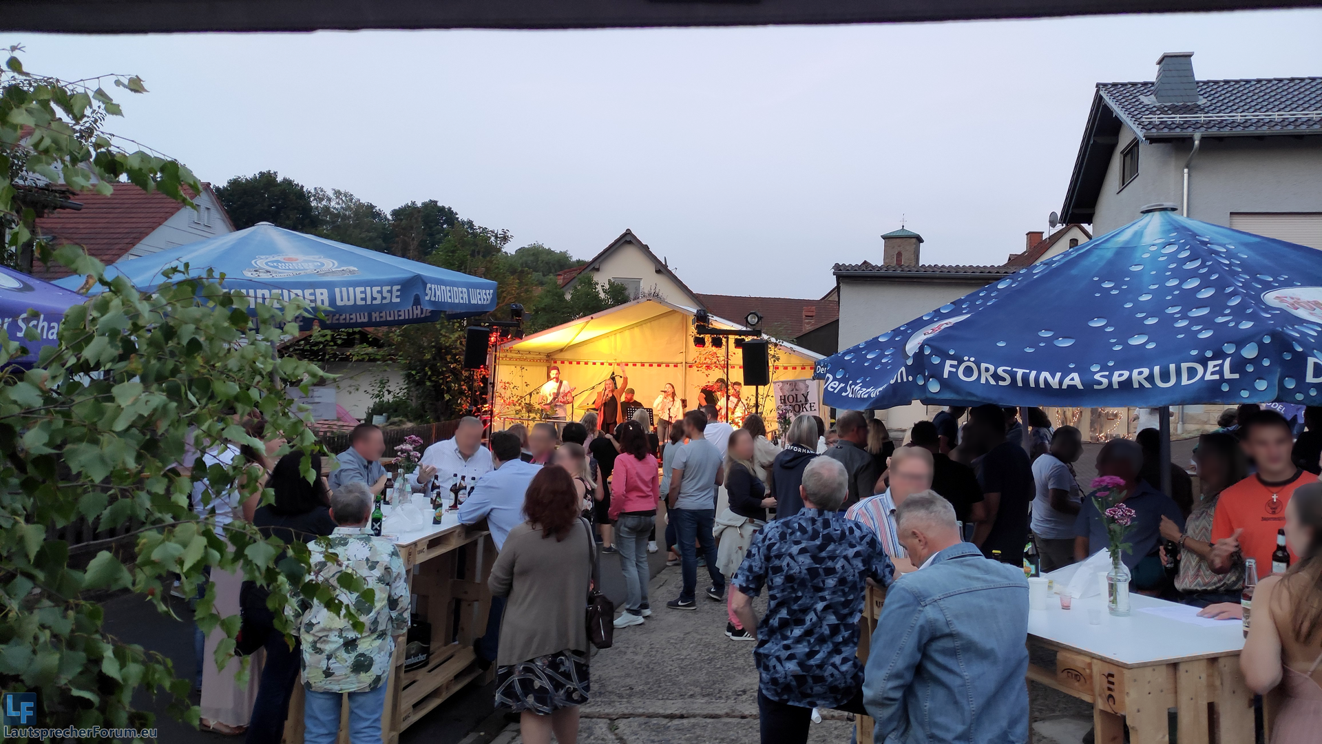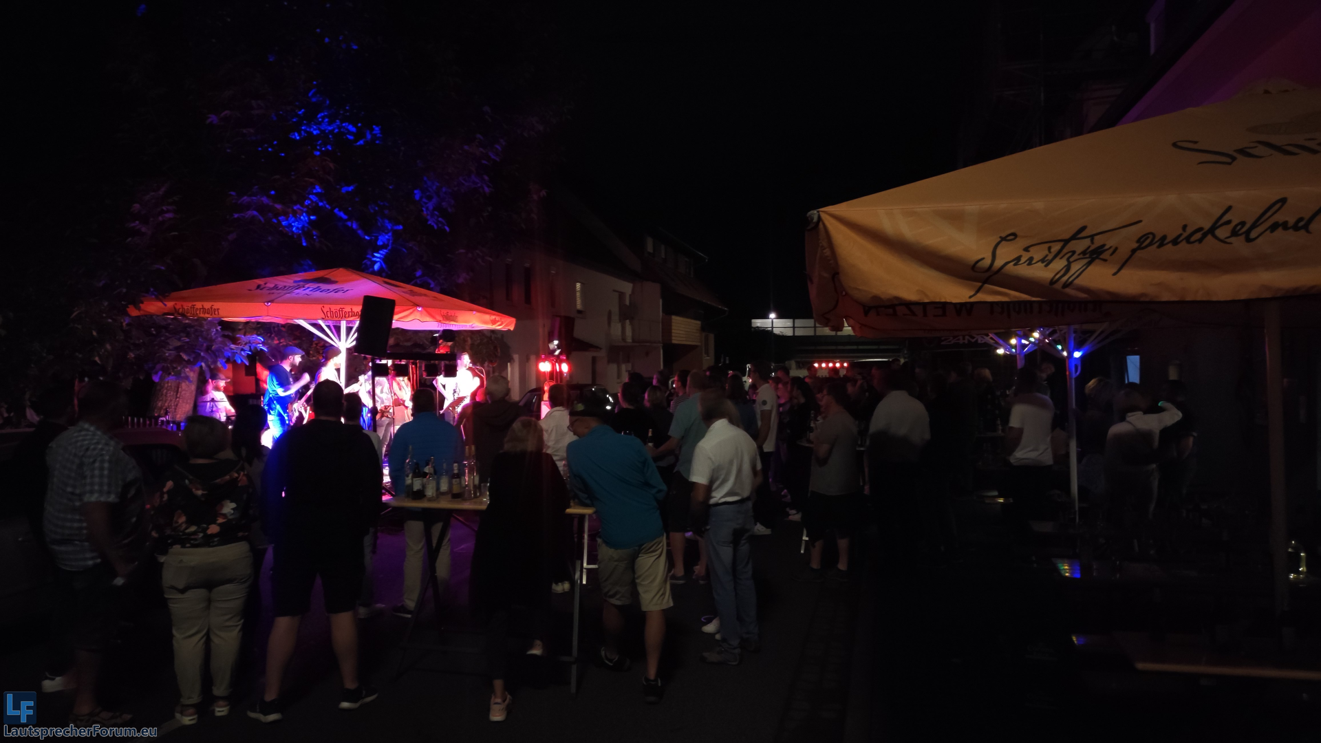 Aufstellung so, dass vor der Bühne die Straße entlang die volle Party ging, rechts von der Bühne (Aus FOH-Sicht) war angenehmer Pegel,