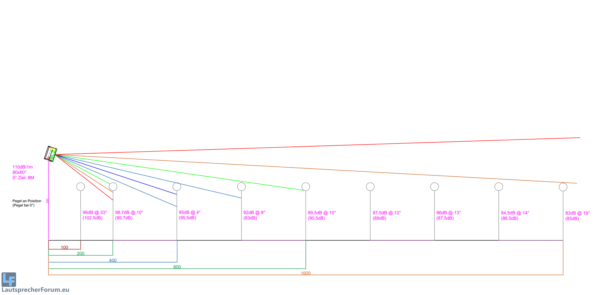 Ein 80x40° 1x12" Topteil mittlerer Preisklasse (XO 1,6kHz), positive und negative Vertikalen (immer gleichfarbig), 0° 5° 10° 15° 20°