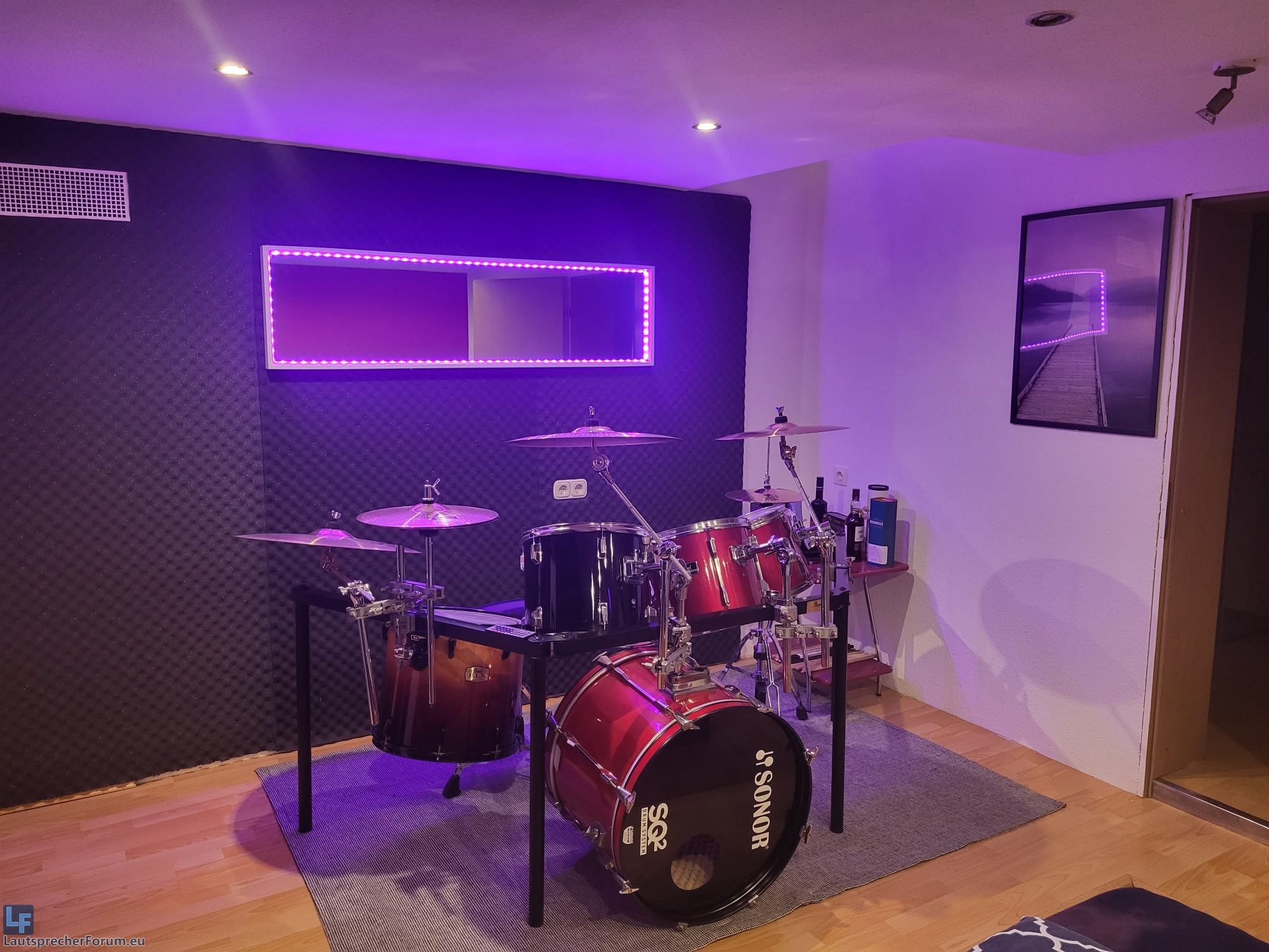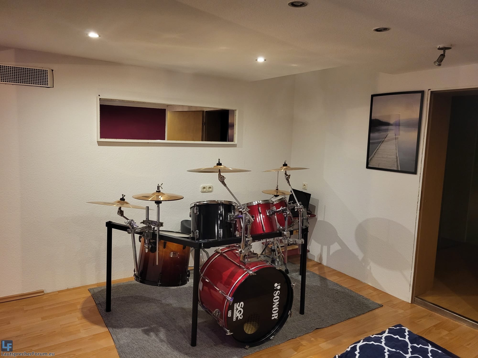 Hinter dem Schlagzeug werde ich die komplette Wand mit einem langflorigen Teppich verkleiden, denn diese wird durch den Durchgang von einem Topteil direkt angestrahlt, für Absorber ist hier aber kein Platz.