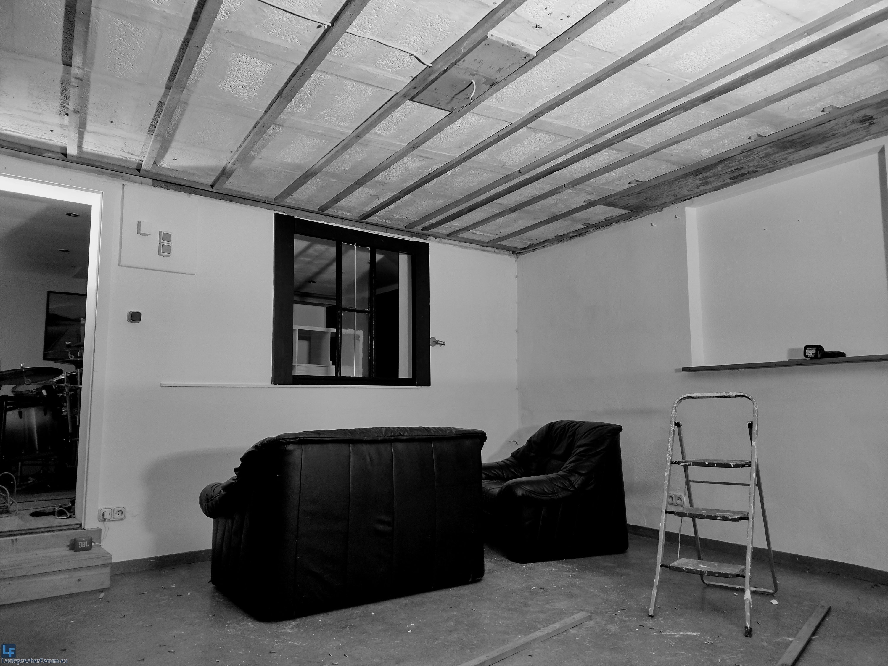 1. Die Trennwand zwischen Partyraum und Schlagzeugraum wird mit bis zu 40cm Steinwolle abgedämmt - der Platz ist hierfür vorhanden und die Messungen zeigen dass hier das größte Potential auf Erfolg besteht.