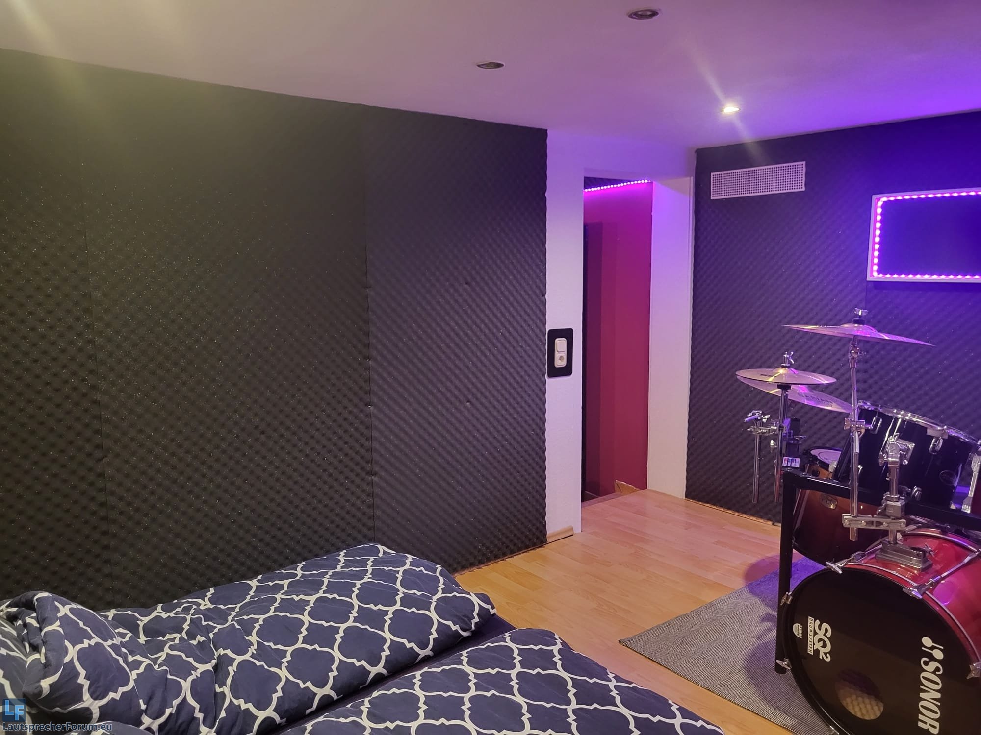 Da der vordere Partyraum über einen Durchgang und ein innenliegendes Fenster über geht in den mittleren Raum (Schlagzeug/ich bin mal betrunken Bett) ergibt sich hier schon eine Raumtiefe von 10 Metern und viele Raumecken.