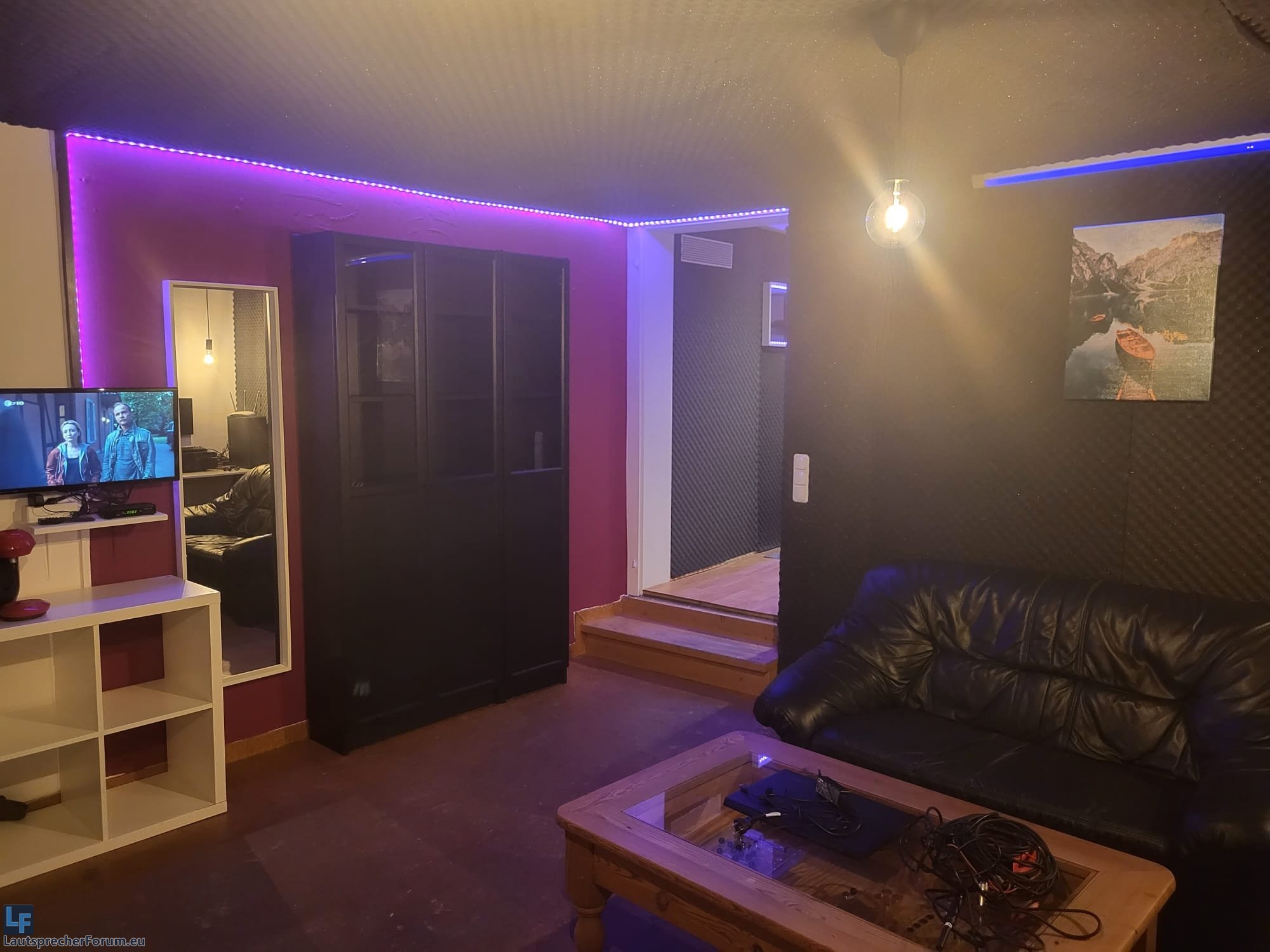 Akustisch ist im Bass das Hauptproblem eine Mode bei rund 30Hz die ca. 15dB ausreißt, mehrere Auslöschungen zwischen 100Hz und 200Hz und eine je nach Abhörposition extrem unterschiedliche Basswiedergabe.