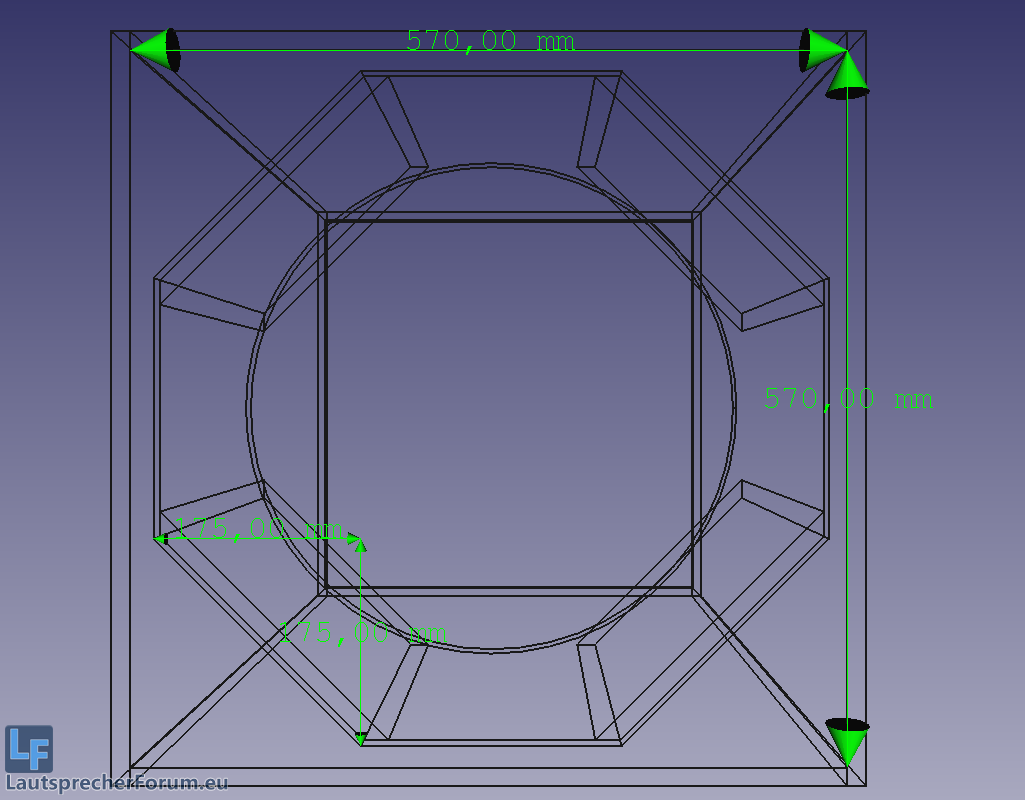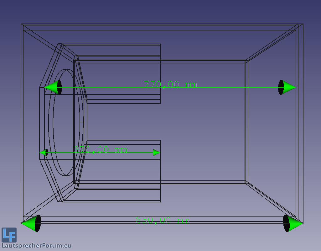 Vielen Dank für die Hinweise bezüglich des Kanals. Tatsächlich hat sich der Sub laut der Simulation massiv verkleinert. Wichtig war mir, dass die Front quadratisch, praktisch, gut ist. Folglich habe ich mich für 60*60 cm Innenmaß entschieden, wo der BR Port 10 cm Breit ist und über die gesamte Höhe geht. Die Tiefe im Inneren habe ich auf 67cm Simuliert, damit noch etwas zusätzliches Volumen einkalkuliere, das vom Treiber eingenommen wird, sowie Versteifungen und auch ein Aktivmodul, das ich unter umständen in den Sub einbauen will. Es soll ja nur eine kleine kompromisslose Plug and Play Anlage werden.
