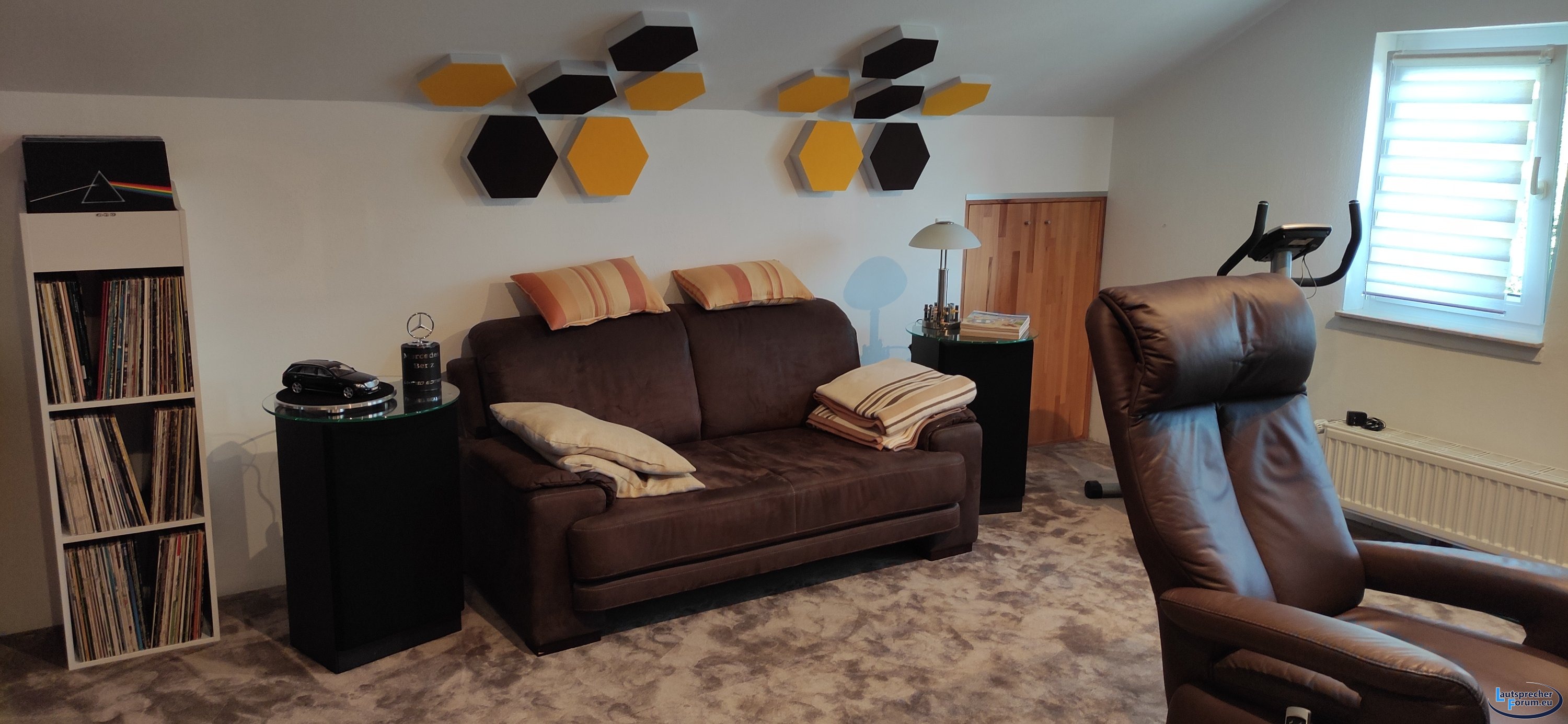 Mein Sitzplatz ist zufälligerweise so, dass bei mir ein rechter Winkel passt und sich die Lautsprecher in einem Spiegel, wo jetzt die Absorber sind, spiegeln würden.
