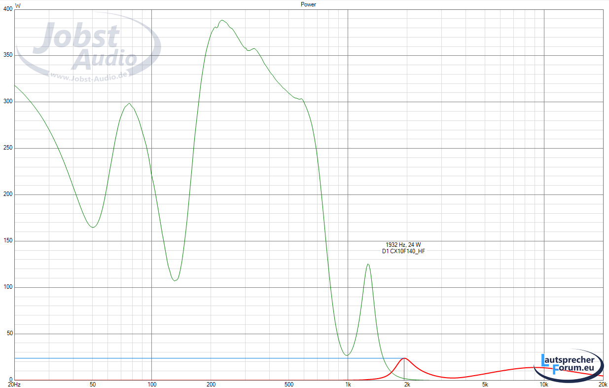 Unser Hochtöner läuft nun, sagen wir ab 2kHz = Fett markiert = circa 116W (Tieftöner dann 190W).