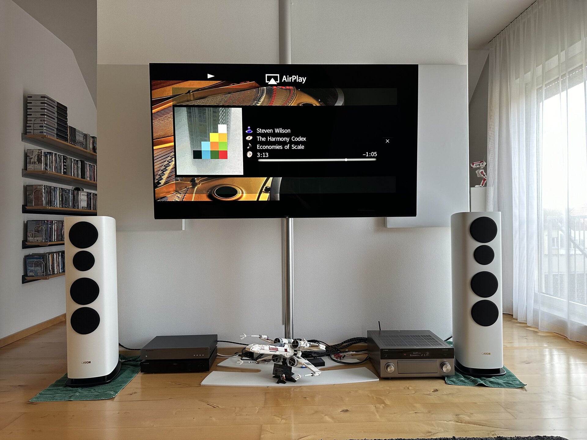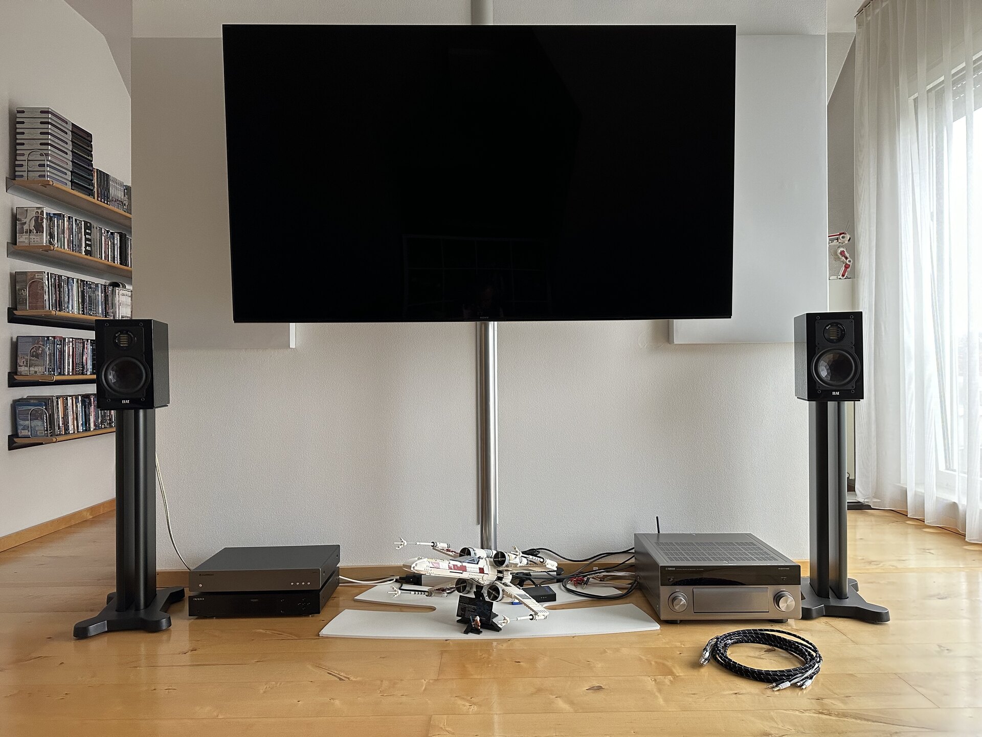 Ich habe einen speziellen Raum als Heimkino bzw. zum Musik hören hergerichtet. Akustisch muss da noch ein wenig gemacht werden, aber im Grunde war ich bisher recht zufrieden. Zudem hat der Raum zig Stages durchlaufen, u.a. auch mit Beamer und 100“ Leinwand, aber irgendwann nervte die Usability und ich habe wieder einen TV gekauft.