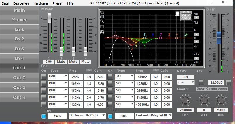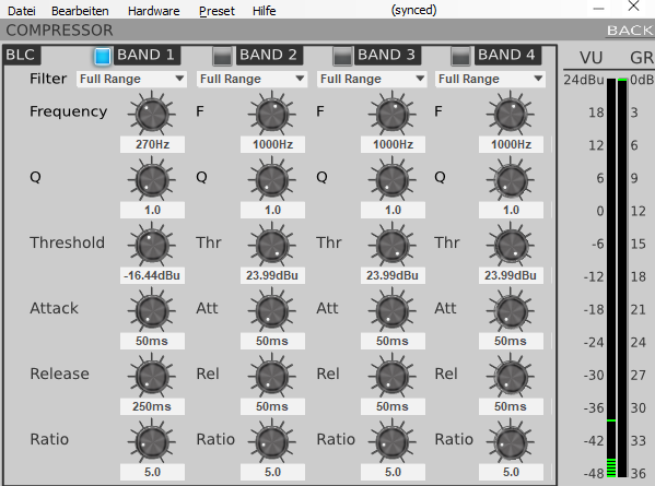 Der Kompressor ist eig auch einfach zu verstehen: 4 unabhängige Bänder, die entweder als Kompressor, RMS Limiter (Ratio 25+) oder Dynamik EQ arbeiten können. Praktisch z.b. für Tops mit passivem Xover, da lässt sich mit zwei Shelf Kompressoren Hochton und Tiefton fast unabhängig voneinander limitieren (ähnlich Lineas Vx Limiter). Auch praktisch für moderne Hochleistungssubs zwei unabhängige RMS Limiter zu setzen: einen bisschen unter Xvar mit eher kürzerer A/R, einen zweiten auf ca 1/3- 1/4 AES als Thermo Limiter mit längerer A/R, bereich mehrerer Sekunden