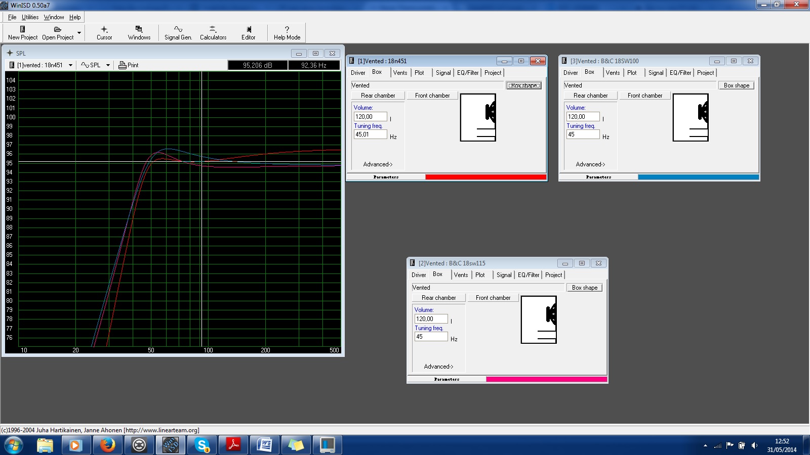 Man sieht in der Simulation schön dass das Tuning so nicht passt, das müsste man bei allen nach unten korrigieren (Port verlängern). Mit so nem "Spassbuckel" untenrum klingt das nicht so besonders...