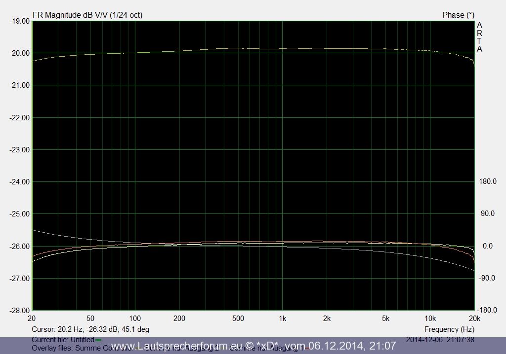 Hier wurde die Resultierende gemessen. Das ganze ist nicht ganz ideal, die Phase dreht sich etwas weg sowie der Frequenzgang ist nicht ganz schnurgerade. Für einen Lautsprecher wäre es aber kein schlechtes Ergebnis - daher verdient der Ctrl wohl erstmal tatsächlich die Bezeichnung "ideal".