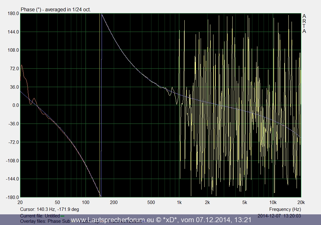 Im Bassbereich wird es durch das kurze Zeitfenster etwas ungenauer, der gelbe Strich zeigt uns, dass ARTA unter knapp 400Hz "schätzt". Dem entsprechend liefert auch die Phase kein verlässliches Ergebnis.